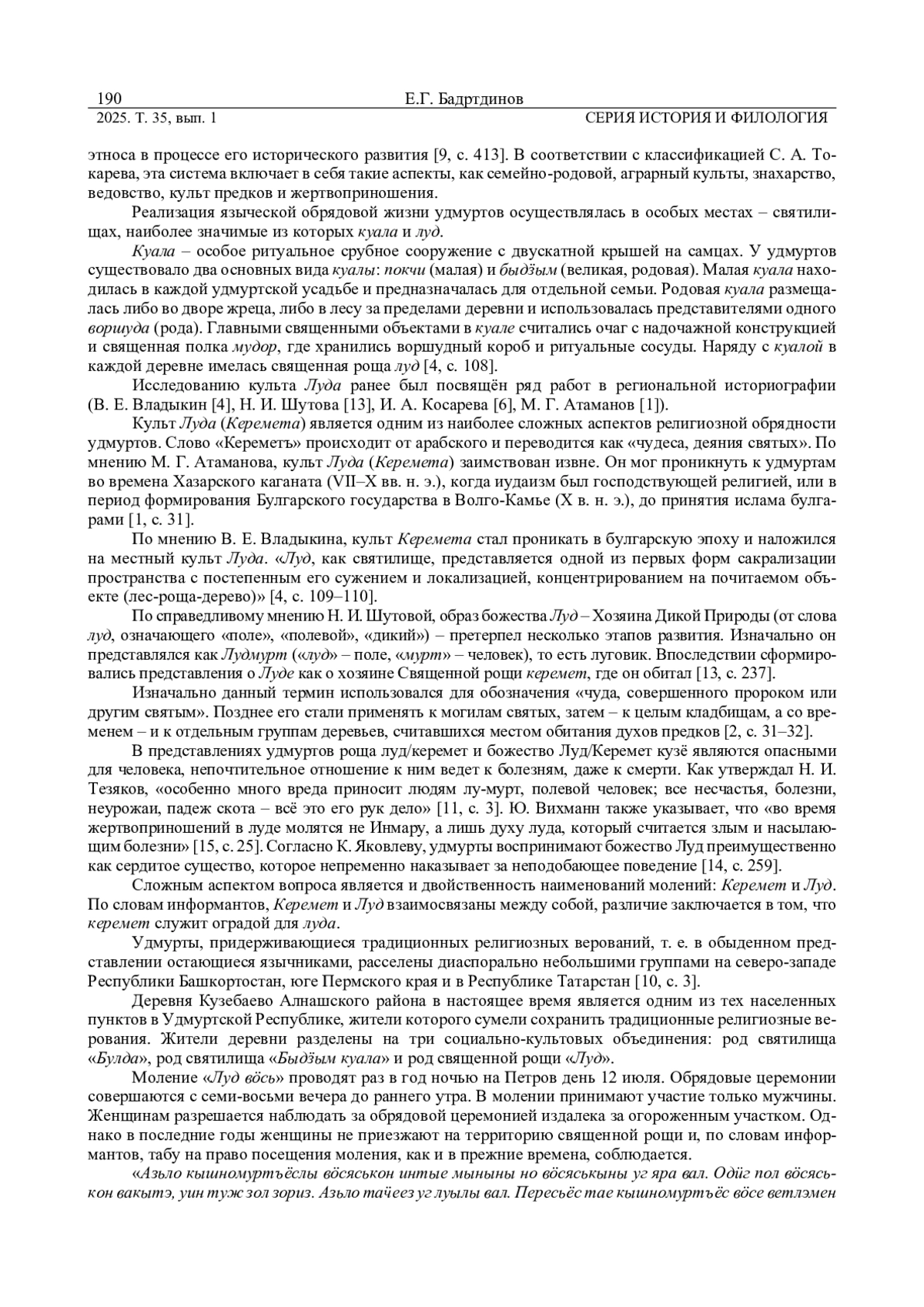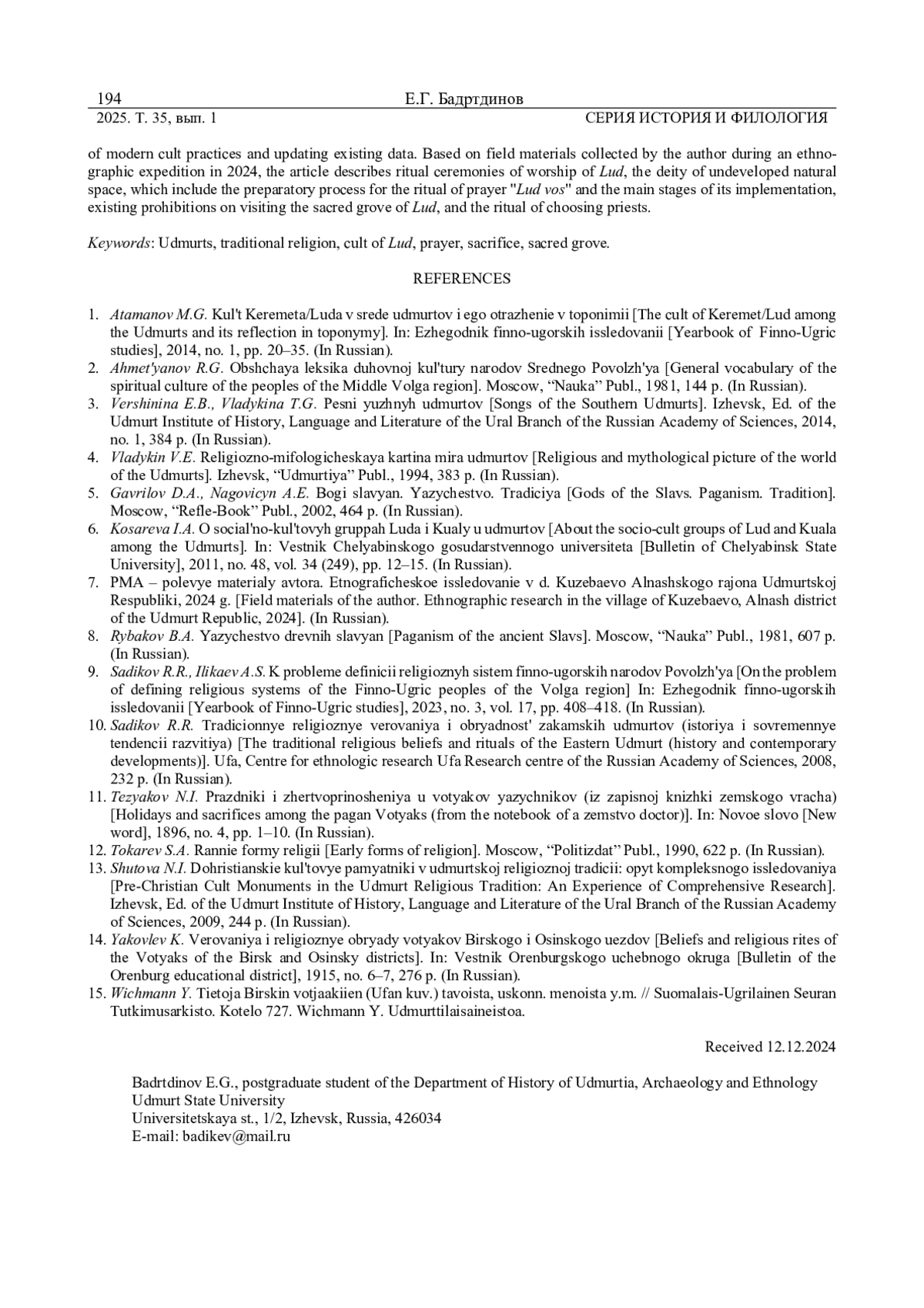 1. 	Атаманов М.Г. Культ Керемета/Луда в среде удмуртов и его отражение в топонимии // Ежегодник финно-угорских исследований. 2014. № 1. С. 20-35. EDN: SAWXNX