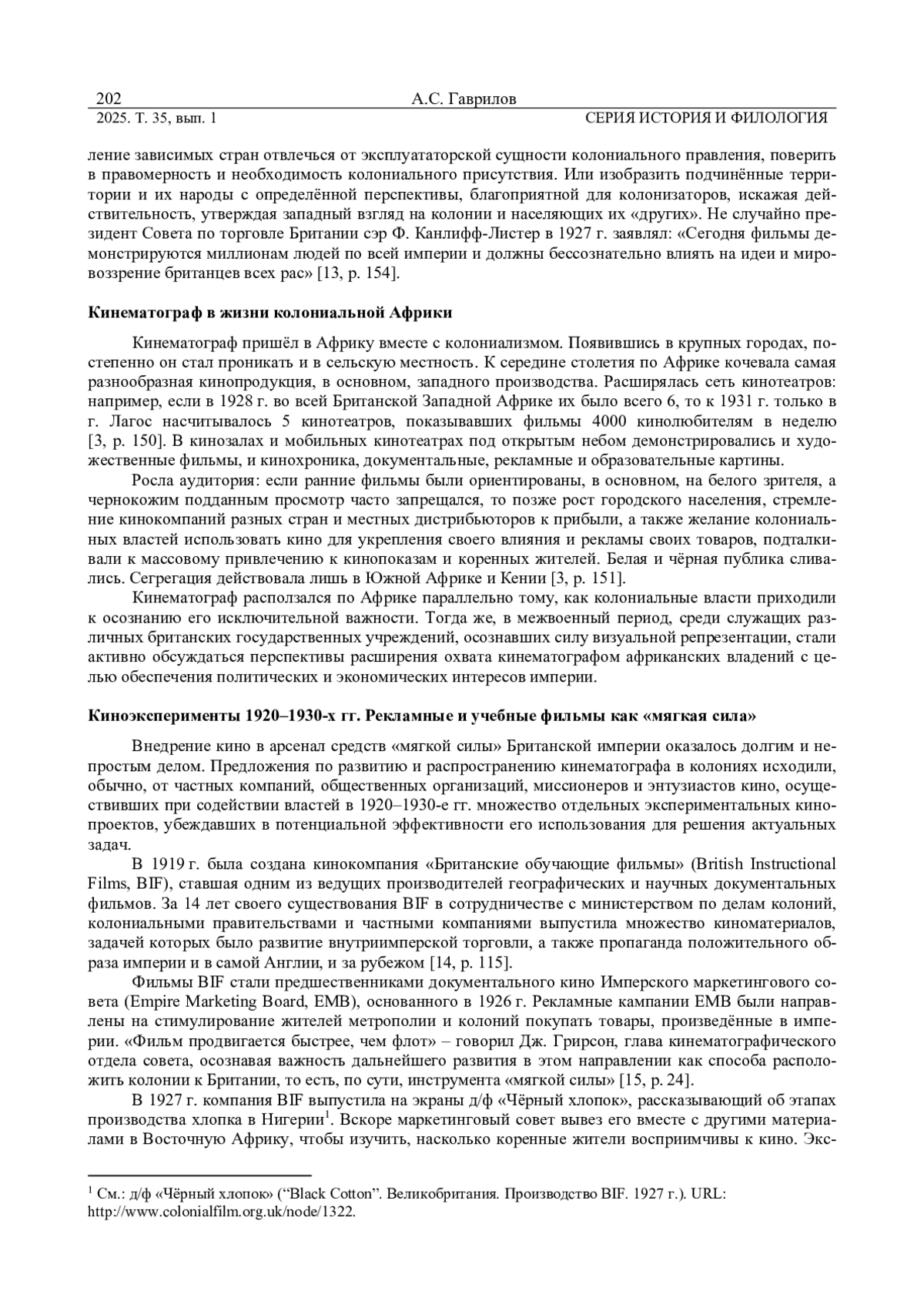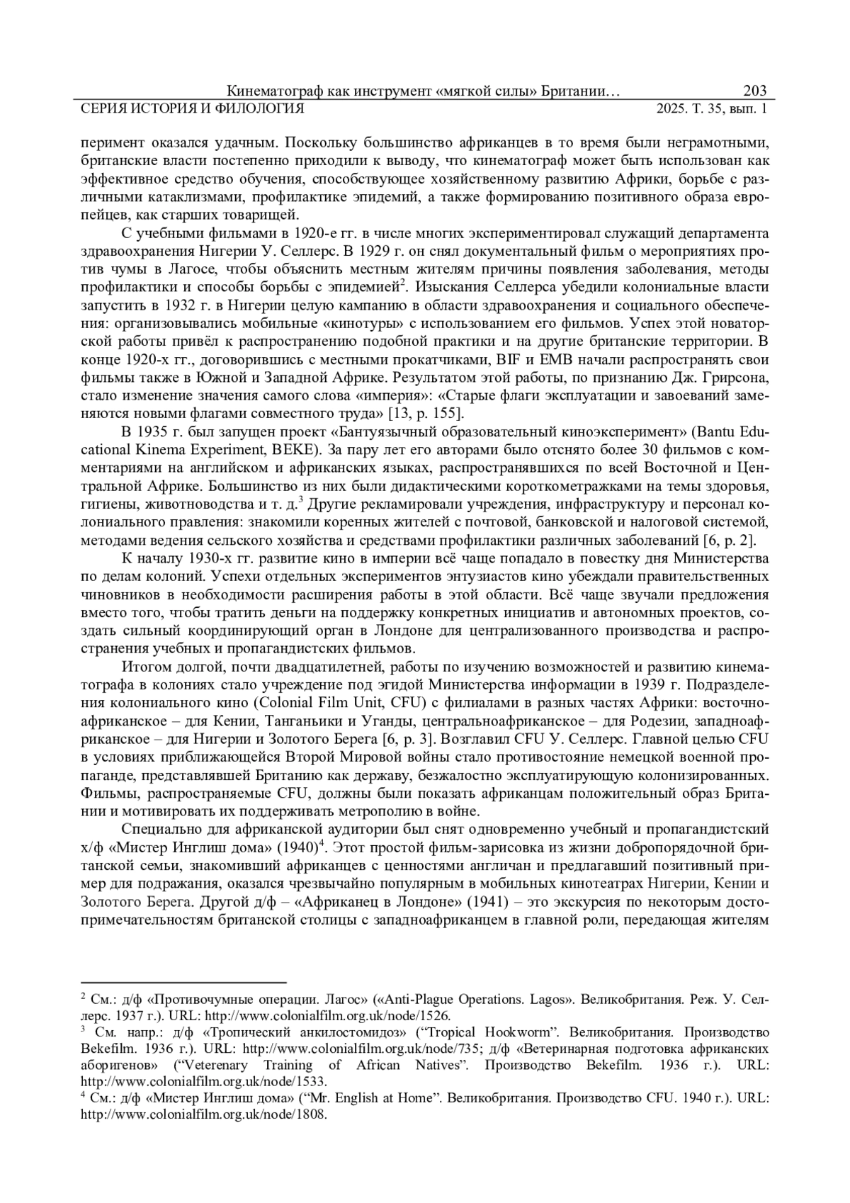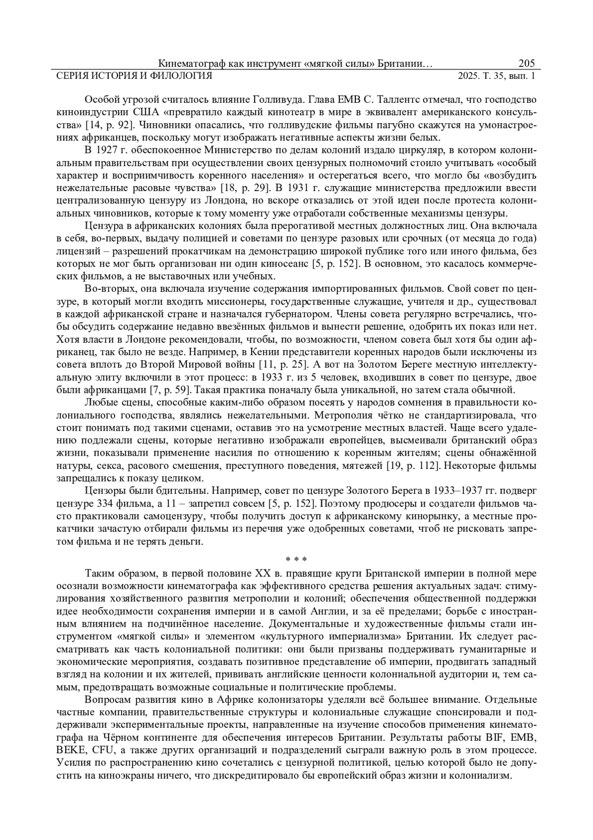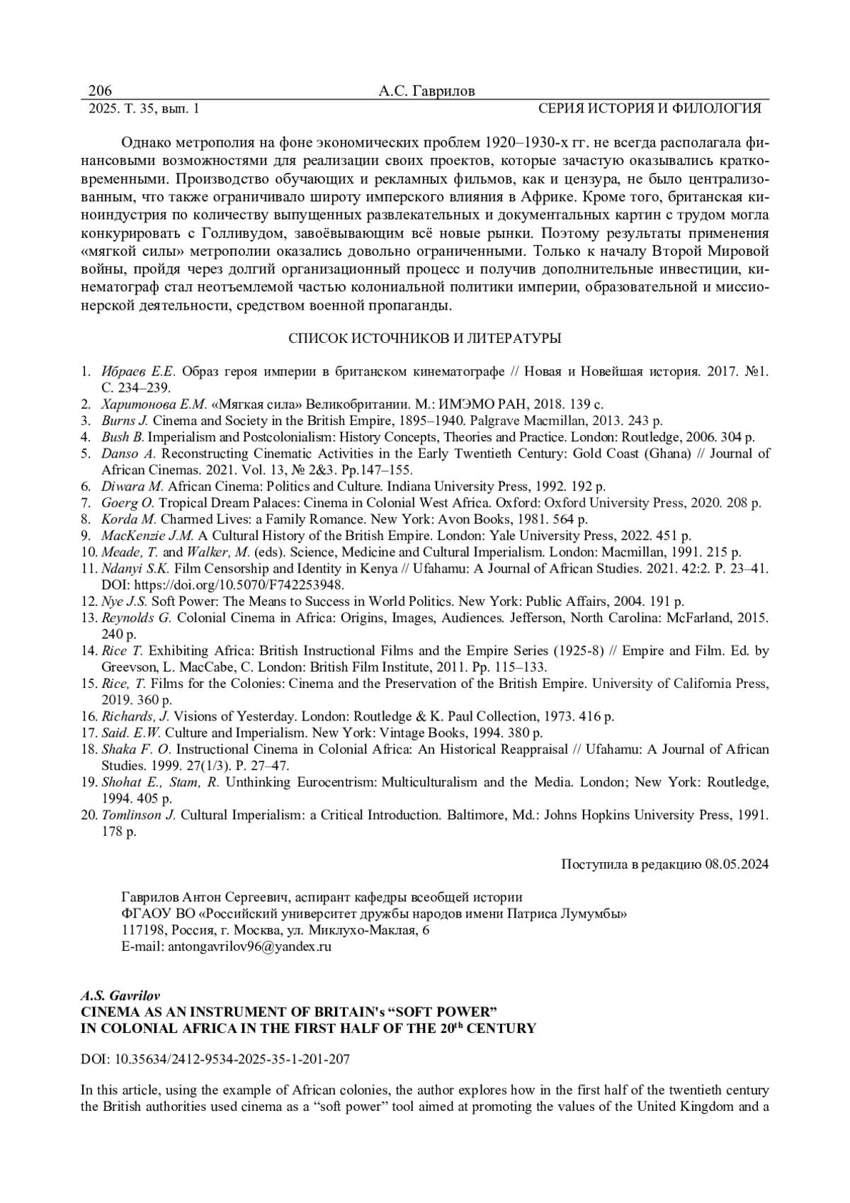 В статье на примере африканских колоний автор исследует, как в первой половине XX в. британские власти использовали кинематограф в качестве инструмента «мягкой силы», направленной на пропаганду ценностей Соединённого Королевства, продвижение положительного образа метрополии, укрепление её власти, стимулирование хозяйственного развития империи. С целью установления степени эффективности такой практики, в статье рассматриваются кампании британских государственных учреждений и автономные проекты по созданию и распространению рекламных, учебных и игровых фильмов на «Чёрном континенте», а также вопросы цензуры. Для выяснения особенностей воздействия фильмов на мнения и убеждения местных жителей, анализируется идеологическое содержание некоторых киноматериалов, предназначенных для демонстрации в колониях. Также затрагивается роль кинематографа Британской империи в распространении стереотипов об африканском «другом», способствовавших формированию его колониального сознания и идентичности. Исследование раскрывает важность культурных аспектов в истории колониализма, позволяет более внимательно рассмотреть проблему взаимодействия кинематографа и имперской власти. Автор приходит к заключению, что, хотя в указанный период эффективность кино как инструмента «мягкой силы» Британии в Африке была ограниченной в силу ряда причин, тем не менее, полученный за это время опыт наглядно показал огромный пропагандистский и дидактический потенциал «важнейшего из искусств», ставшего затем неотъемлемой частью колониальной политики метрополии.