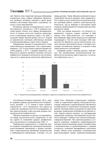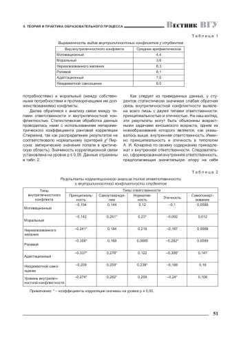Нанаш взгляд, студентам с низким уровнем ответственности – как внешней, так и внутренней – присущ высокий уровень внутриличностной конфликтности. Низкий уровень внешней ответственности, но при этом вынужденная включенность в учебный процесс могут быть связаны с противоречиями сфер «хочу» и «надо». Низкий уровень внутренней ответственности может быть связан как с противоречиями между «не могу» и «надо», так и противоречиями между сферами «надо» и «надо». В первом случае сутью «не могу» выступит невозможность опираться на себя, а «надо» будет представлено условиями учебного процесса. Во втором случае студент без сформированной внутренней ответственности может столкнуться с проблемами выбора между двумя равнозначными задачами учебной деятельности.