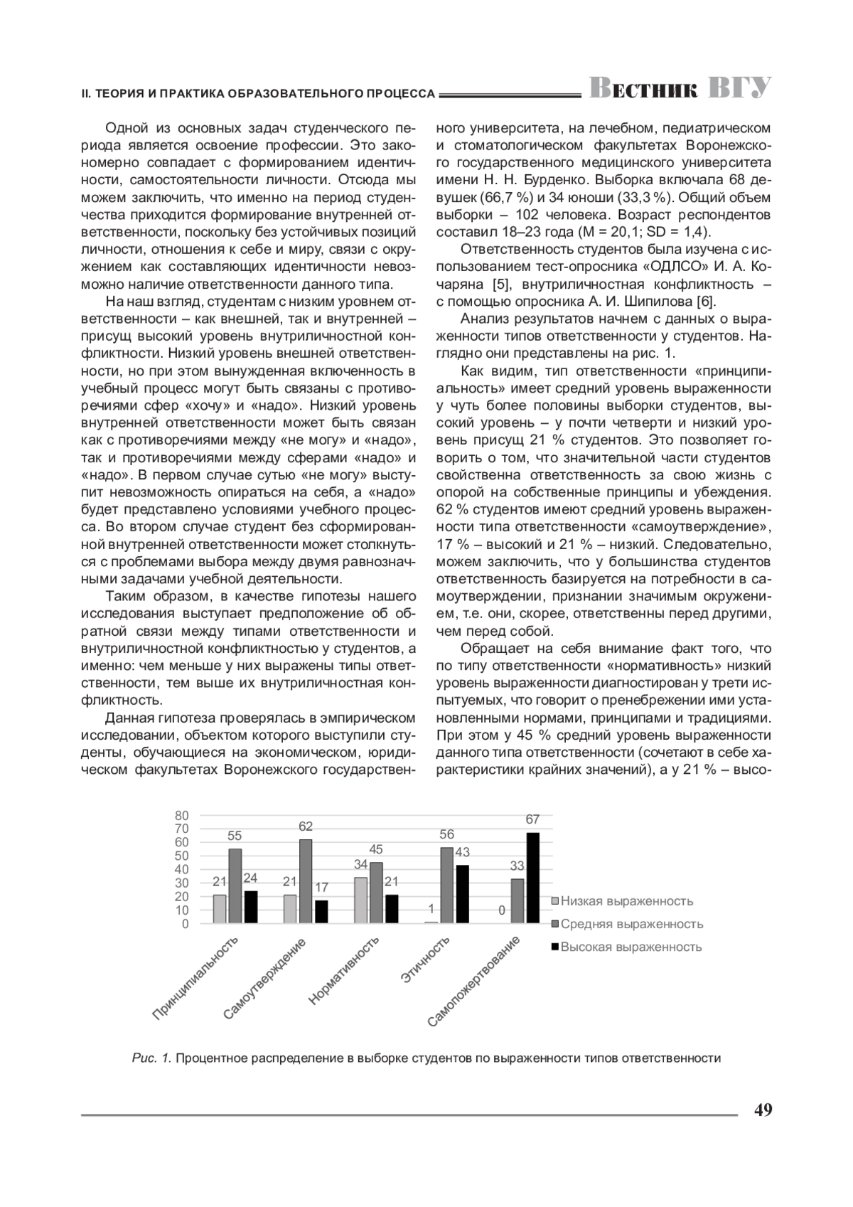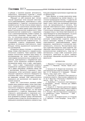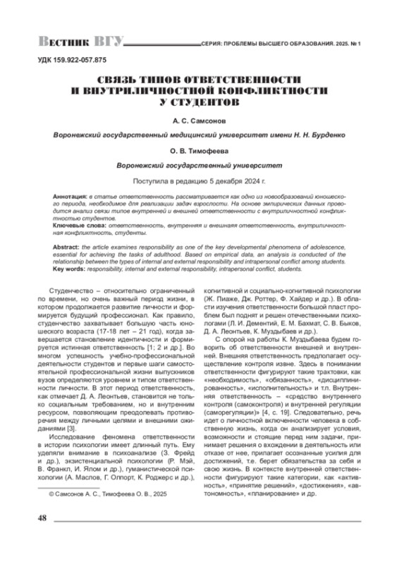 В статье ответственность рассматривается как одно из новообразований юношеского периода, необходимое для реализации задач взрослости. На основе эмпирических данных проводится анализ связи типов внутренней и внешней ответственности с внутриличностной конфликтностью студентов.