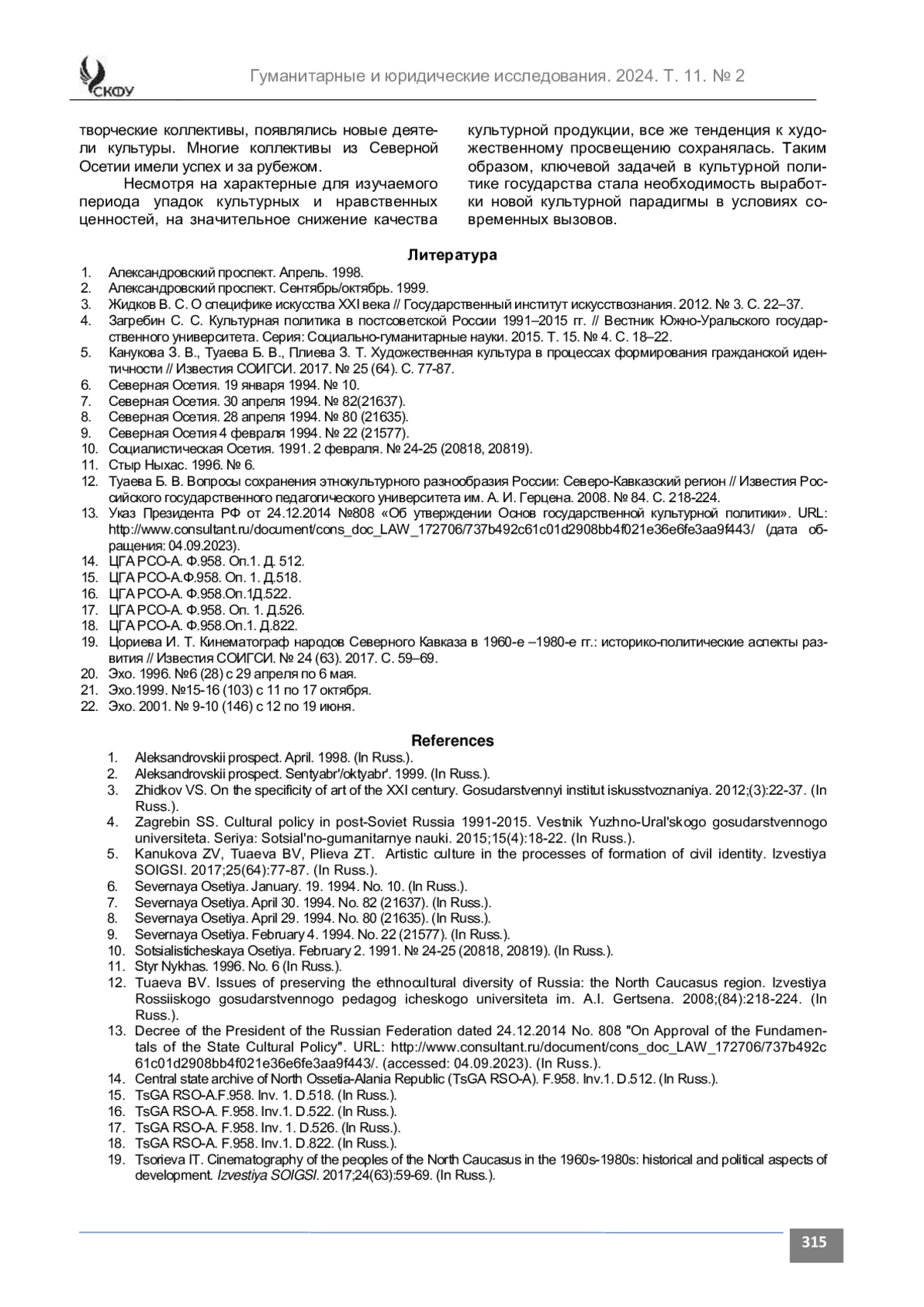 19. Цориева И. Т. Кинематограф народов Северного Кавказа в 1960-е -1980-е гг.: историко-политические аспекты развития // Известия СОИГСИ. № 24 (63). 2017. С. 59-69.