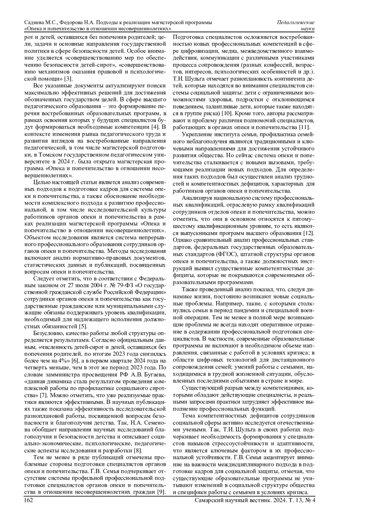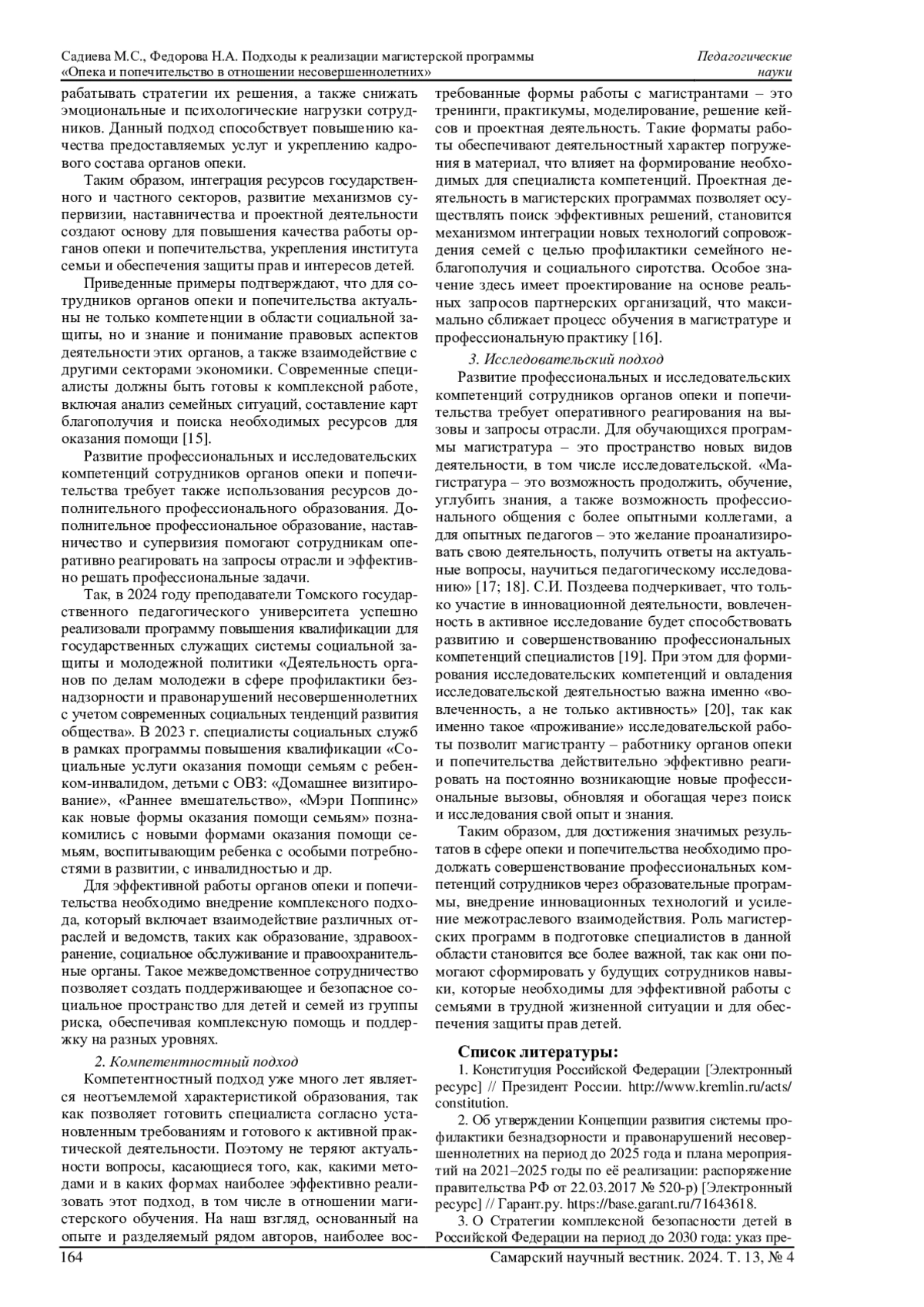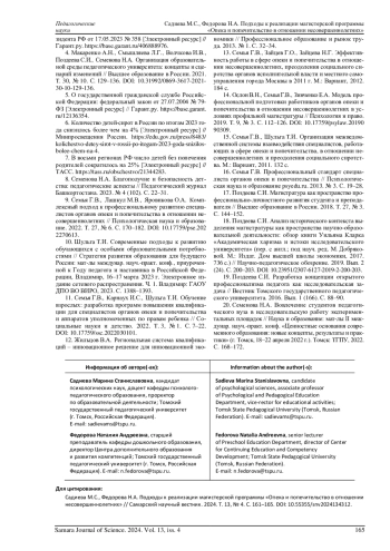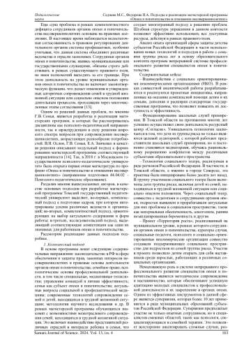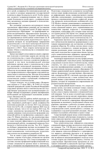 В статье рассматриваются современные вызовы, связанные с развитием профессиональных компетенций сотрудников опеки и попечительства в отношении несовершеннолетних. Необходимые компетенции могут формироваться в условиях магистерской программы. Данная программа может быть основана на комплексном, компетентностном и исследовательском подходах. Представлен опыт реализации обозначенных подходов в рамках магистерской программы «Опека и попечительство в отношении несовершеннолетних» в Томском государственном педагогическом университете. Освещены практики межведомственного, надотраслевого взаимодействия с семьями и детьми, находящимися в трудной жизненной ситуации и социально опасном положении, как способ реализации комплексного подхода; деятельностные форматы работы с магистрантами как путь реализации компетентностного подхода; вовлечение магистрантов в исследовательскую работу как механизм реагирования на социальные вызовы в меняющихся условиях. Профессиональная деятельность рассматривается с позиции социального пространства, национальной системы профессиональных квалификаций, отраслевой рамки квалификаций, высшего и дополнительного профессионального образования, рынка труда и компетентностных дефицитов. Приводятся примеры успешных государственных инициатив и программ, направленных на профилактику социального сиротства и семейного неблагополучия, раскрываются ресурсы проектной деятельности социально ориентированных некоммерческих организаций в сфере защиты детства.