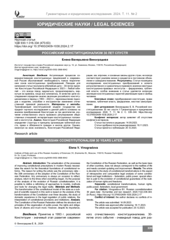 Введение. Актуализация процессов совершенствования конституционных предписаний в современной России обусловливает необходимость поиска теоретических основ конституционных преобразований. Поводом для написания статьи послужила юбилейная дата – 30-летие принятия Конституции Российской Федерации в 2023 г. Любой юбилей – это всегда повод задуматься, проанализировать, вернуться во времена, когда все начиналось. В качестве цели исследования определен анализ эволюции российского конституционализма в период с 1993 – 2023 гг., переосмысление подходов к моделям, способам и инструментам изменения отечественной правовой реальности.