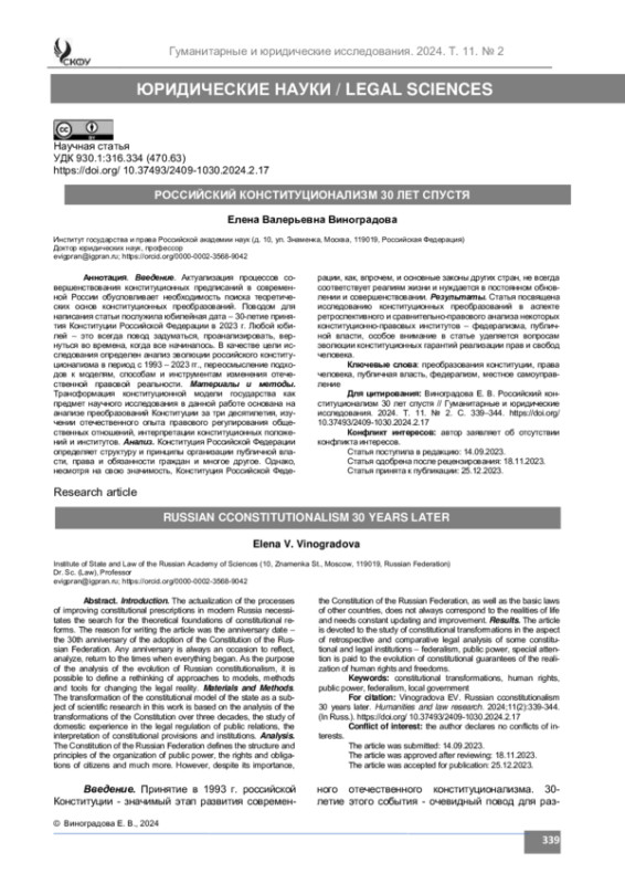 Материалы и методы. Трансформация конституционной модели государства как предмет научного исследования в данной работе основана на анализе преобразований Конституции за три десятилетия, изучении отечественного опыта правового регулирования общественных отношений, интерпретации конституционных положений и институтов.