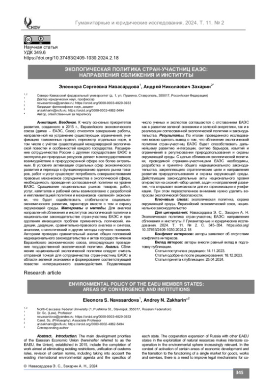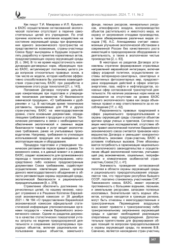 Введение. К числу основных приоритетов развития, созданного в 2015 г., Евразийского экономического союза (далее – ЕАЭС, Союз) относится завершение работы, направленной на устранение существующих ограничений, унификацию таможенных правил, пересмотр отдельных норм, в том числе с учётом существующей международной экологической повестки и особенностей каждого государства. Расширение сотрудничества России с другими государствами ЕАЭС в эксплуатации природных ресурсов делает межгосударственное взаимодействие в природоохранной сфере все более актуальным. В условиях активизации отдельных сфер экономического развития и перехода к функционированию единого рынка товаров, работ и услуг существует потребность совершенствования правовых механизмов сотрудничества в экологической сфере, необходимость проведения согласованной политики на уровне ЕАЭС. Сращивание национальных рынков товаров, работ, услуг, капиталов и рабочей силы взаимосвязано с разработкой и имплементацией политики и механизмов «зеленой» экономики, что будет содействовать стабильности социально-экономического развития, гарантируя вместе с тем и охрану окружающей среды.