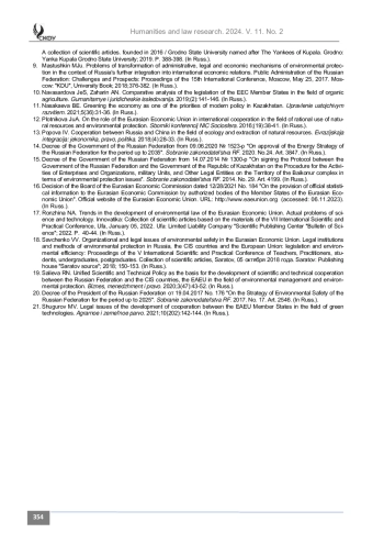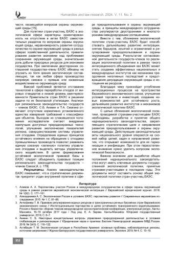 1. Алимов А. А. Перспективы участия России в международном сотрудничестве в сфере охраны окружающей среды в рамках развития евразийской экономической интеграции // Евразийский юридический журнал. 2016. № 1(92). С. 177-181.