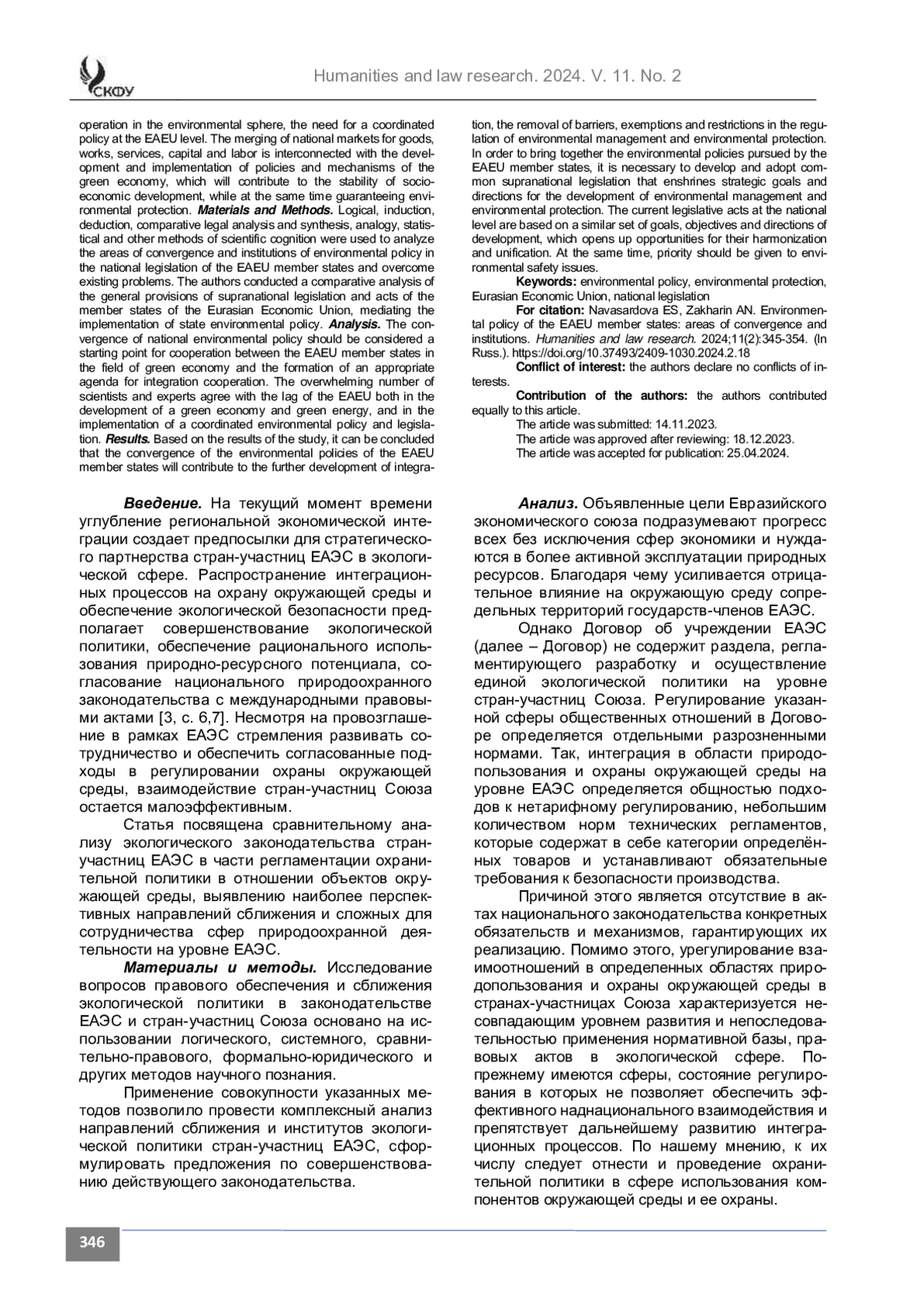 Материалы и методы. Для анализа направлений сближения и институтов экологической политики в национальном законодательстве стран-участниц ЕАЭС и преодоления имеющихся проблем применялись логический, индукции, дедукции, сравнительно-правового анализа и синтеза, аналогии, статистический и другие методы научного познания. Авторами проведен сравнительный анализ общих положений наднационального законодательства и актов государств-членов Евразийского экономического союза, опосредующих проведение государственной экологической политики.