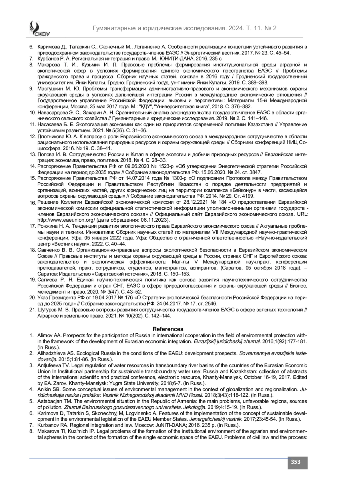 6. Каримова Д., Татаркин С., Сконечный М., Логвиненко А. Особенности реализации концепции устойчивого развития в природоохранном законодательстве государств-членов ЕАЭС // Энергетический вестник. 2017. № 23. С. 45-54.