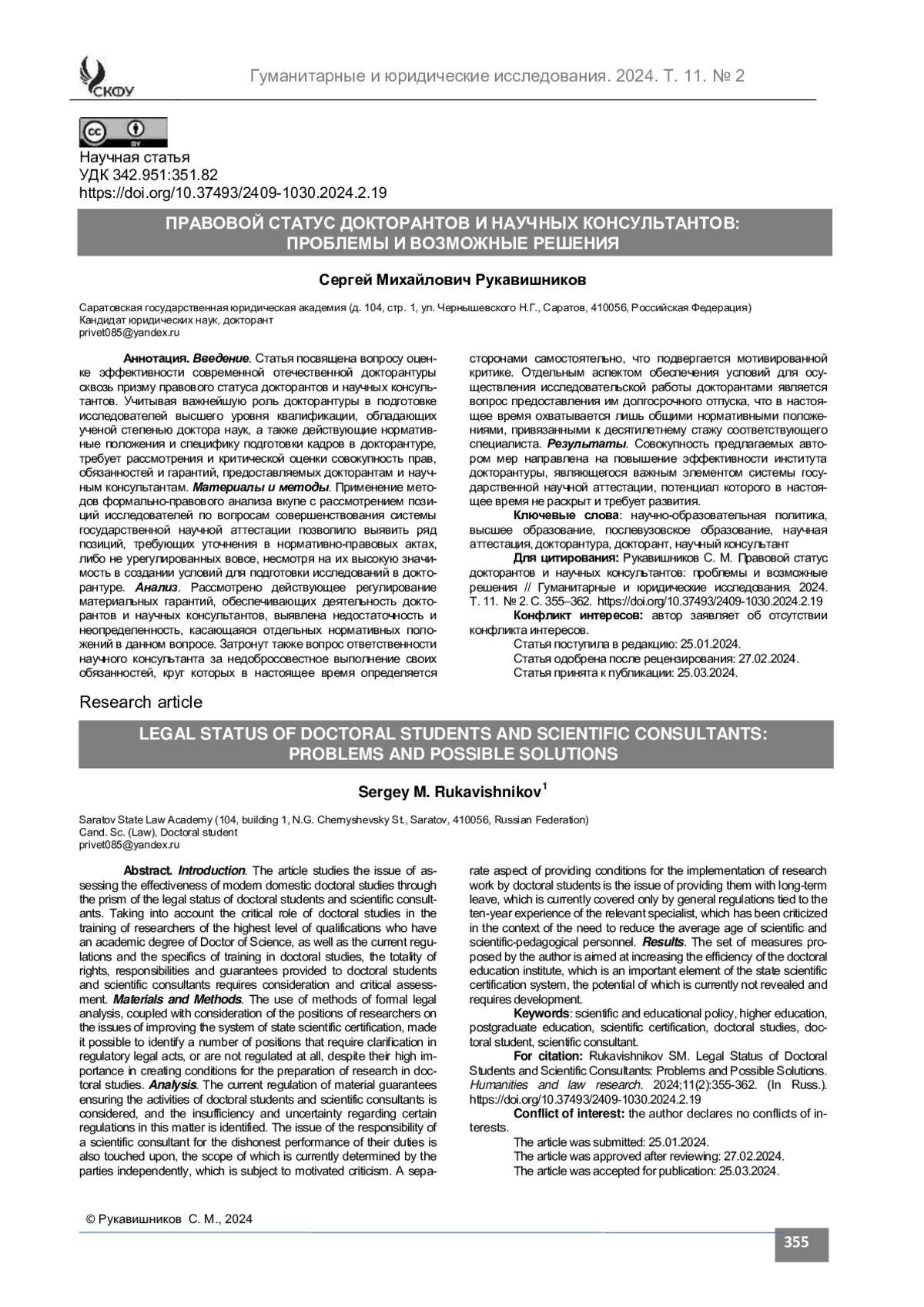 Введение. Статья посвящена вопросу оценке эффективности современной отечественной докторантуры сквозь призму правового статуса докторантов и научных консультантов. Учитывая важнейшую роль докторантуры в подготовке исследователей высшего уровня квалификации, обладающих ученой степенью доктора наук, а также действующие нормативные положения и специфику подготовки кадров в докторантуре, требует рассмотрения и критической оценки совокупность прав, обязанностей и гарантий, предоставляемых докторантам и научным консультантам.