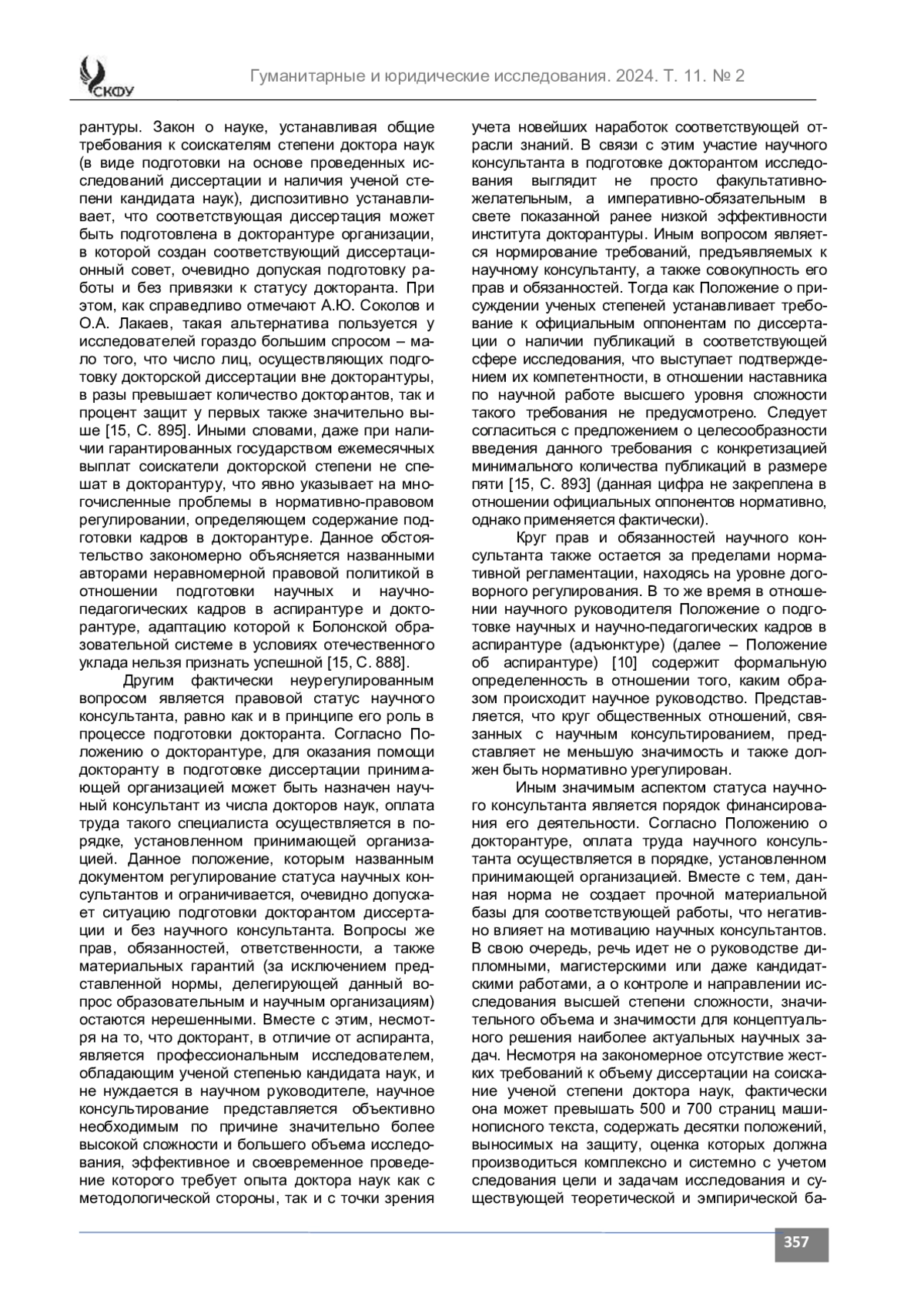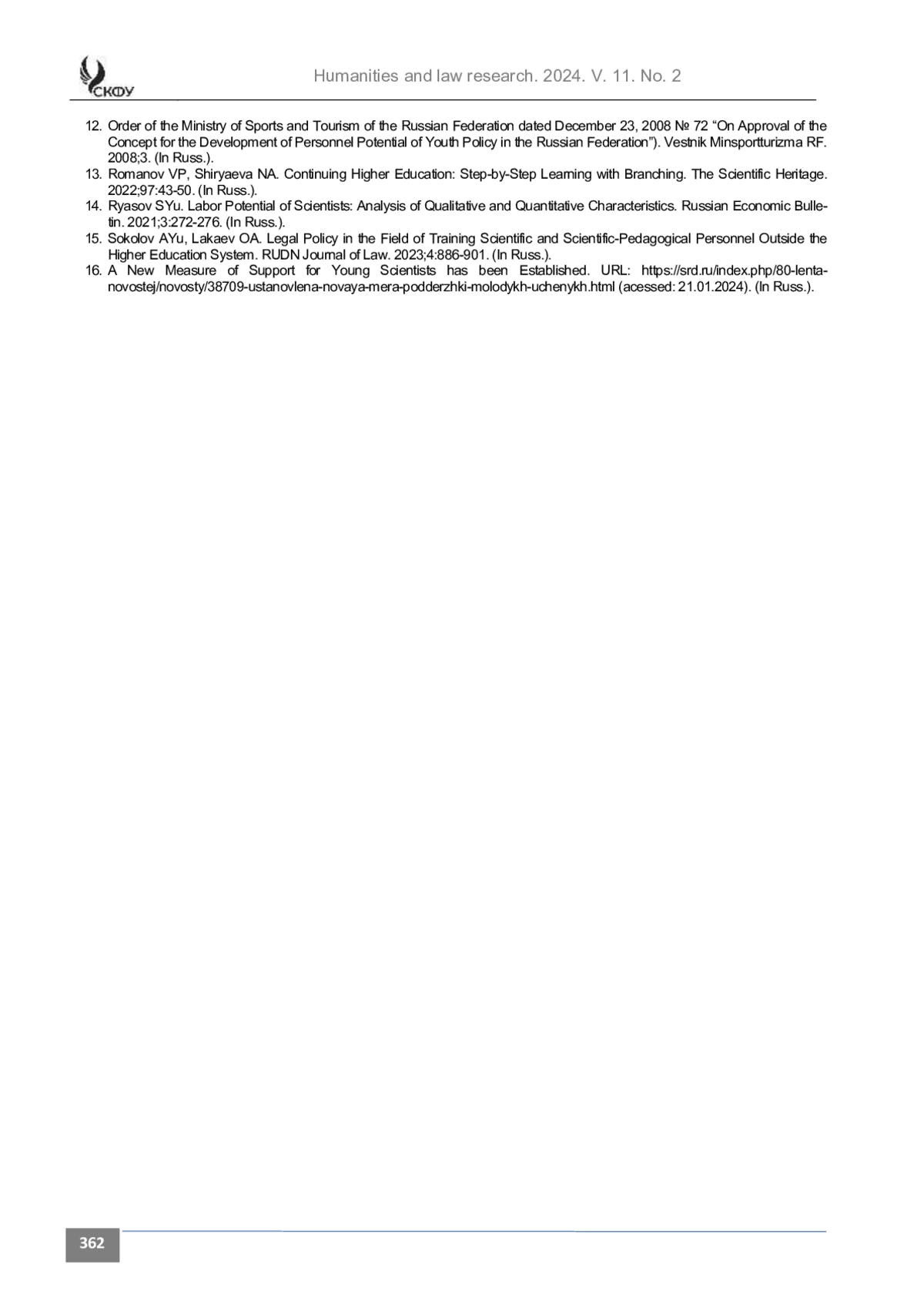 15. Соколов А. Ю., Лакаев О. А. Правовая политика в сфере подготовки научных и научно-педагогических кадров вне системы высшего образования // RUDN Journal of Law. 2023. Т. 27. № 4. С. 886-901.