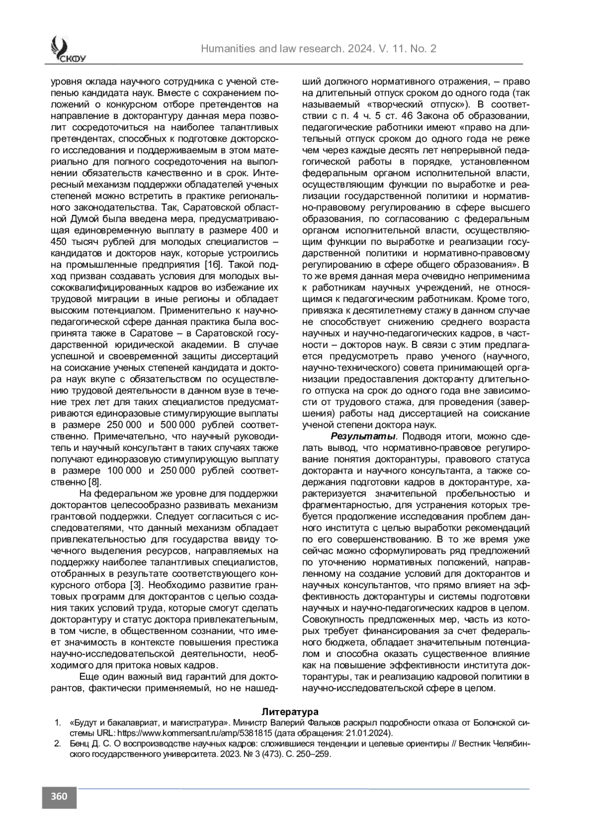 2. Бенц Д. С. О воспроизводстве научных кадров: сложившиеся тенденции и целевые ориентиры // Вестник Челябинского государственного университета. 2023. № 3 (473). С. 250-259.