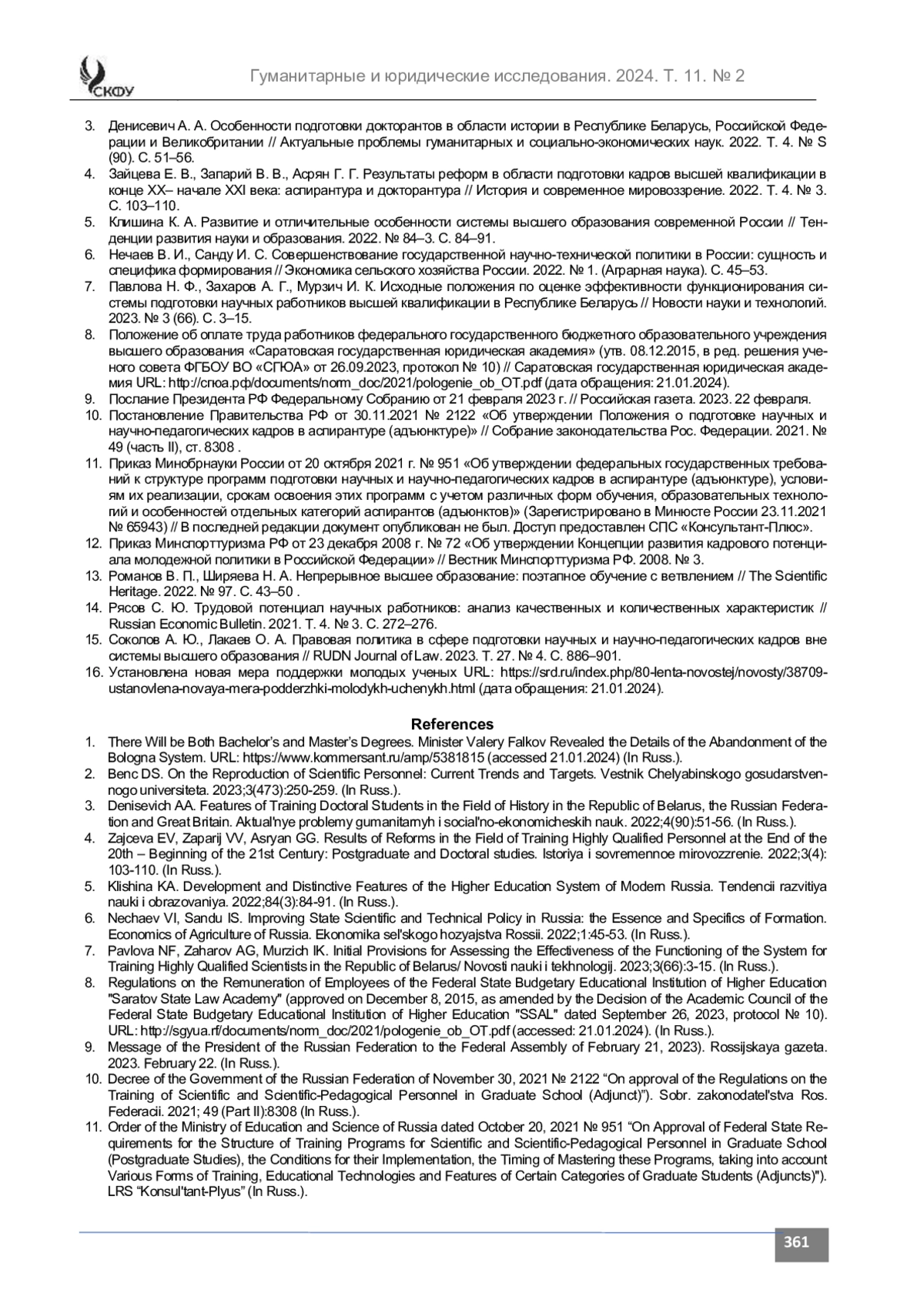 4. Зайцева Е. В., Запарий В. В., Асрян Г. Г. Результаты реформ в области подготовки кадров высшей квалификации в конце ХХ- начале XXI века: аспирантура и докторантура // История и современное мировоззрение. 2022. Т. 4. № 3. С. 103-110.
