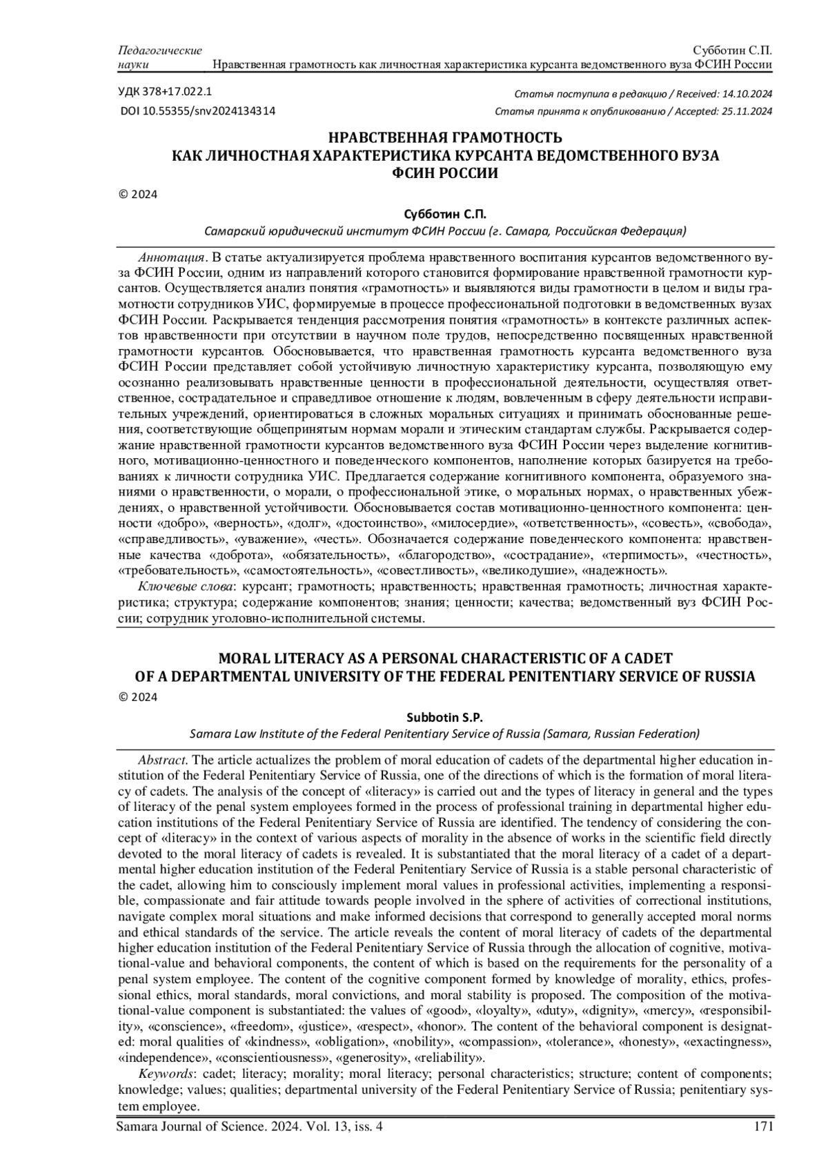 В статье актуализируется проблема нравственного воспитания курсантов ведомственного вуза ФСИН России, одним из направлений которого становится формирование нравственной грамотности курсантов. Осуществляется анализ понятия «грамотность» и выявляются виды грамотности в целом и виды грамотности сотрудников УИС, формируемые в процессе профессиональной подготовки в ведомственных вузах ФСИН России. Раскрывается тенденция рассмотрения понятия «грамотность» в контексте различных аспектов нравственности при отсутствии в научном поле трудов, непосредственно посвященных нравственной грамотности курсантов. Обосновывается, что нравственная грамотность курсанта ведомственного вуза ФСИН России представляет собой устойчивую личностную характеристику курсанта, позволяющую ему осознанно реализовывать нравственные ценности в профессиональной деятельности, осуществляя ответственное, сострадательное и справедливое отношение к людям, вовлеченным в сферу деятельности исправительных учреждений, ориентироваться в сложных моральных ситуациях и принимать обоснованные решения, соответствующие общепринятым нормам морали и этическим стандартам службы. Раскрывается содержание нравственной грамотности курсантов ведомственного вуза ФСИН России через выделение когнитивного, мотивационно-ценностного и поведенческого компонентов, наполнение которых базируется на требованиях к личности сотрудника УИС. Предлагается содержание когнитивного компонента, образуемого знаниями о нравственности, о морали, о профессиональной этике, о моральных нормах, о нравственных убеждениях, о нравственной устойчивости. Обосновывается состав мотивационно-ценностного компонента: ценности «добро», «верность», «долг», «достоинство», «милосердие», «ответственность», «совесть», «свобода», «справедливость», «уважение», «честь». Обозначается содержание поведенческого компонента: нравственные качества «доброта», «обязательность», «благородство», «сострадание», «терпимость», «честность», «требовательность», «самостоятельность», «совестливость», «великодушие», «надежность».