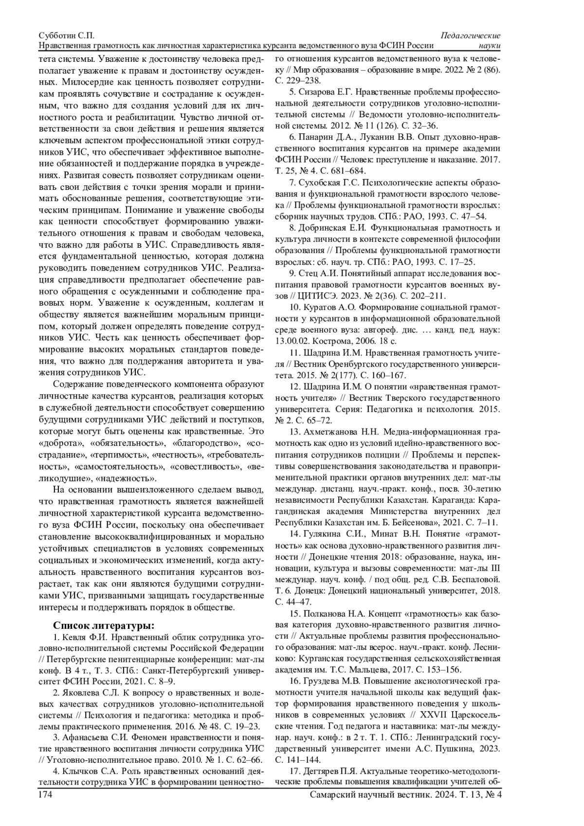 4. 	Клычков С.А. Роль нравственных оснований деятельности сотрудника УИС в формировании ценностного отношения курсантов ведомственного вуза к человеку // Мир образования - образование в мире. 2022. № 2 (86). С. 229-238. EDN: KKFXOA