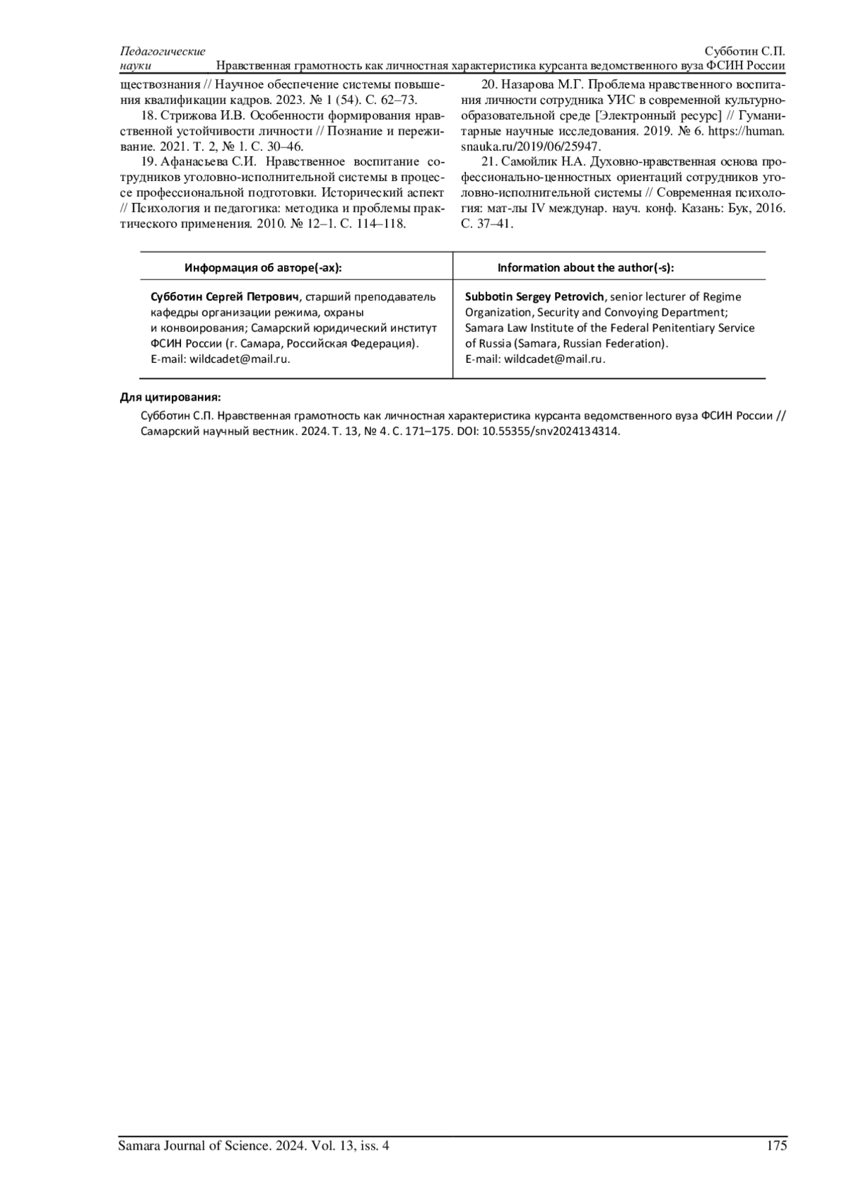 3. 	Афанасьева С.И. Феномен нравственности и понятие нравственного воспитания личности сотрудника УИС // Уголовно-исполнительное право. 2010. № 1. С. 62-66. EDN: NCOKYB