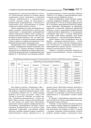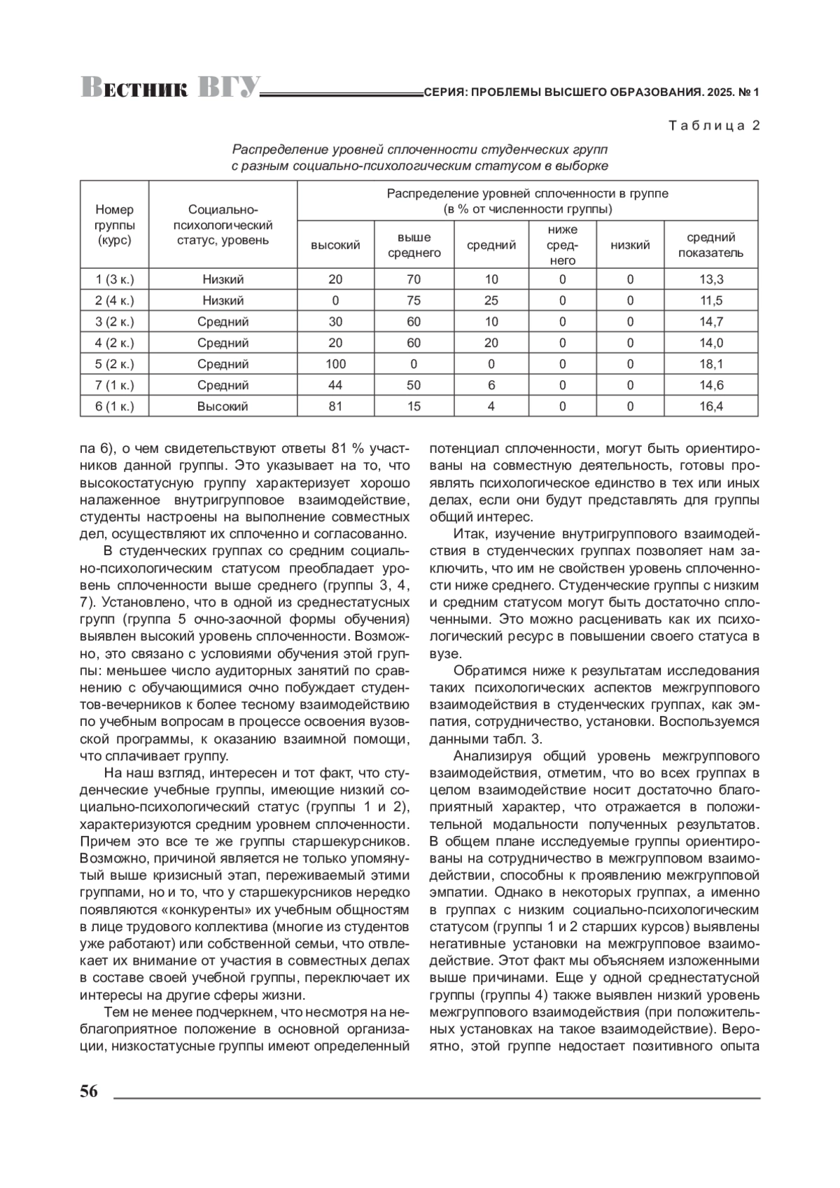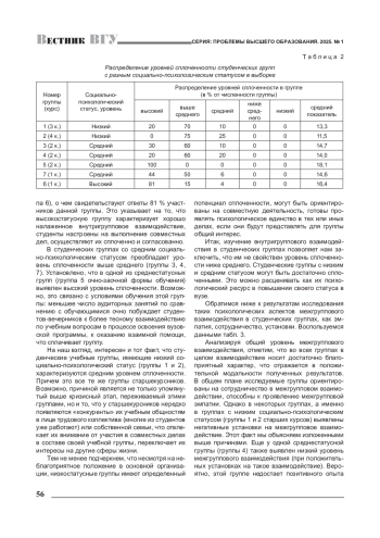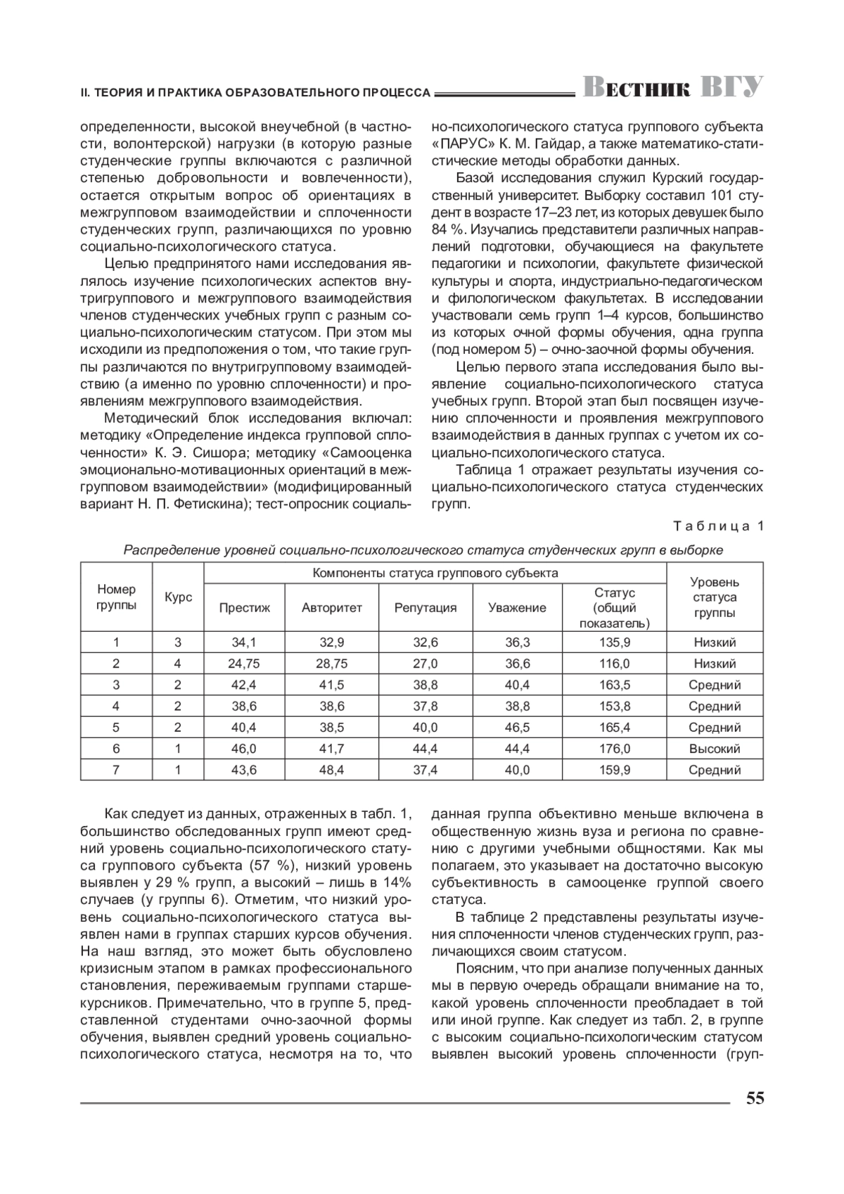 В статье анализируется проблематика внутри- и межгруппового взаимодействия членов современных студенческих групп. Приведены результаты эмпирического исследования студенческих учебных групп, имеющих разный социально-психологический статус. Установлено, что студенческие учебные группы с разным социально-психологическим статусом различаются по уровню сплоченности и проявлениям межгруппового взаимодействия их членов.