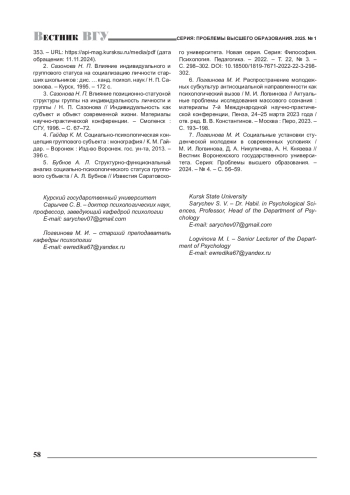 7. 	Логвинова М. И. Социальные установки студенческой молодежи в современных условиях / М. И. Логвинова, Д. А. Никуличева, А. Н. Князева II Вестник Воронежского государственного университета. Серия: Проблемы высшего образования. -2024. - № 4. - С. 56-59.