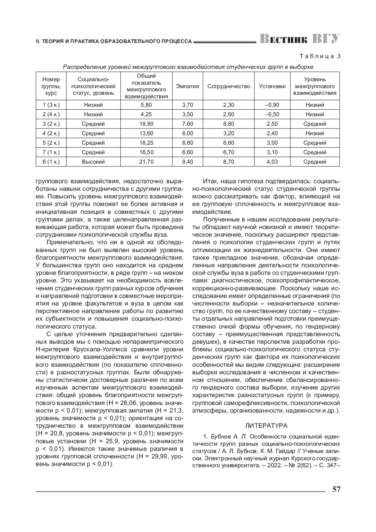 1. 	Бубнов А. Л. Особенности социальной идентичности групп разных социально-психологических статусов / А. Л. Бубнов, К. М. Гайдар // Ученые записки. Электронный научный журнал Курского государственного университета. - 2022. - № 2(62). - С. 347-353. - URL: https://api-mag.kursksu.ru/media/pdf (дата обращения: 11.11.2024). EDN: DDHFOT