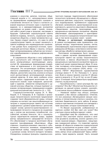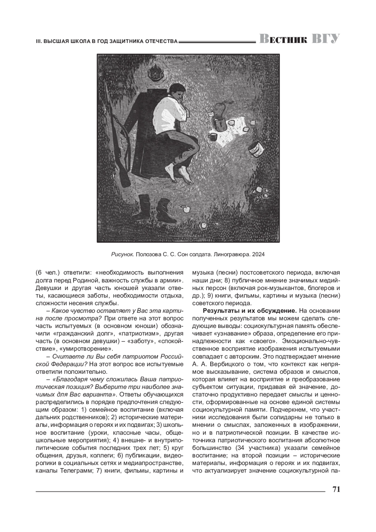На основании полученных результатов мы можем сделать следующие выводы: социокультурная память обеспечивает «узнавание» образа, определение его принадлежности как «своего». Эмоционально-чувственное восприятие изображения испытуемыми совпадает с авторским. Это подтверждает мнение А. А. Вербицкого о том, что контекст как непрямое высказывание, система образов и смыслов, которая влияет на восприятие и преобразование субъектом ситуации, придавая ей значение, достаточно продуктивно передает смыслы и ценности, сформированные на основе единой системы социокультурной памяти. Подчеркнем, что участники исследования были солидарны не только в мнении о смыслах, заложенных в изображении, но и в патриотической позиции.