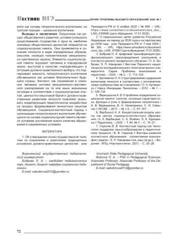 5. 	Верещагина А. В. К проблеме определения социальной памяти: понятие, основные характеристики, функции и роль в формировании патриотизма / А. В. Верещагина, В. Н. Нечипуренко, С. И. Самыгин//ИСОМ.-2017.-№ 1-2.-С. 97-107.