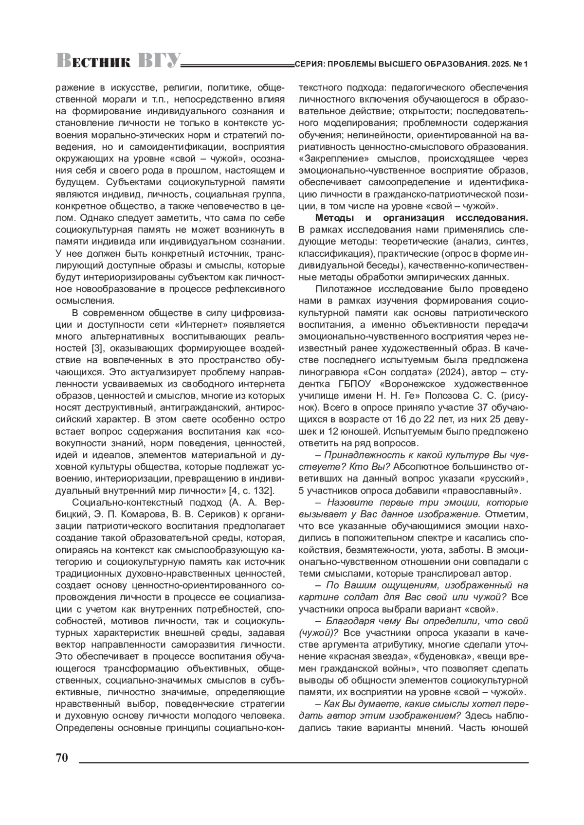 В статье рассматривается проблема формирования социокультурной памяти как основы патриотического воспитания. Раскрывается значение социально-контекстного подхода к процессу духовно-нравственного и патриотического воспитания обучающихся как смыслообразующей деятельности. Приводятся результаты исследования объективности эмоционально-чувственного восприятия обучающимся художественного образа в контексте социокультурной памяти русского народа.