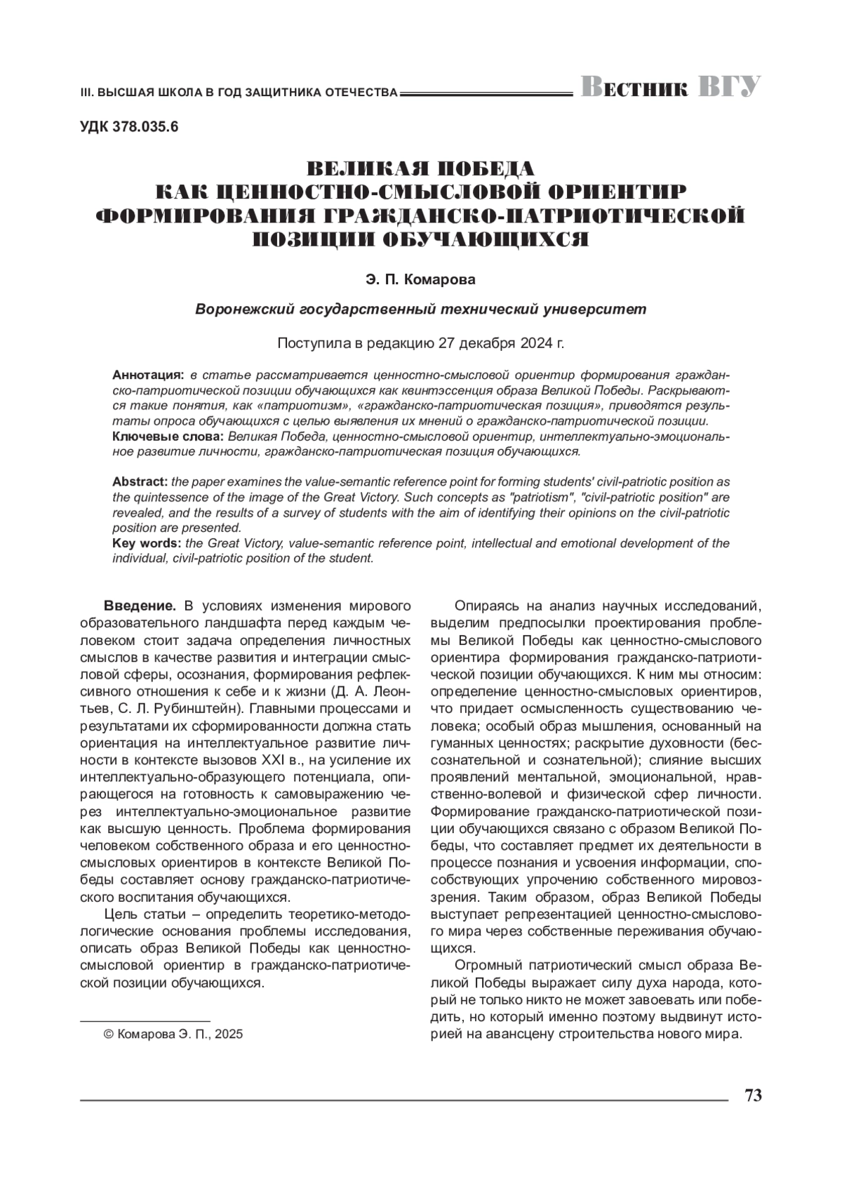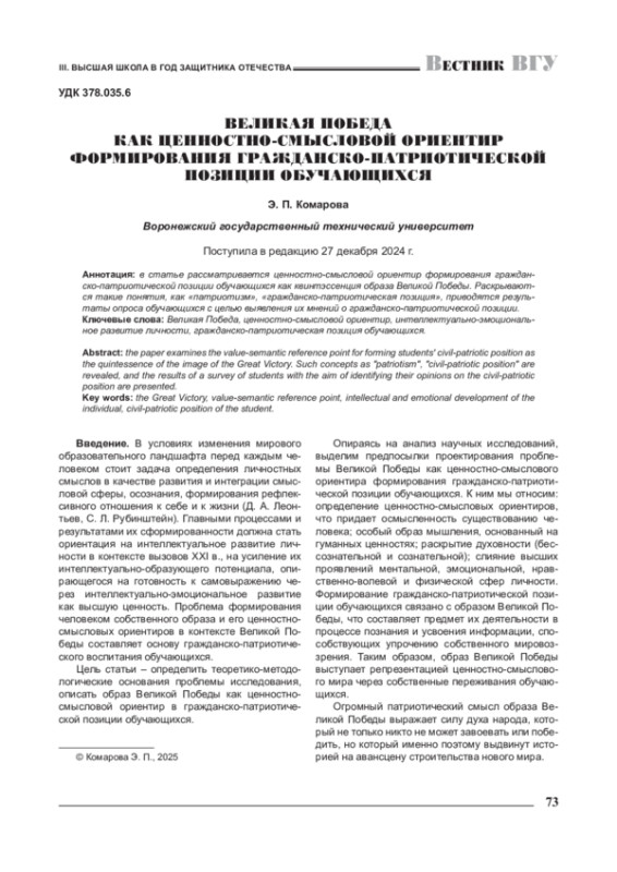 В статье рассматривается ценностно-смысловой ориентир формирования гражданско-патриотической позиции обучающихся как квинтэссенция образа Великой Победы. Раскрываются такие понятия, как «патриотизм», «гражданско-патриотическая позиция», приводятся результаты опроса обучающихся с целью выявления их мнений о гражданско-патриотической позиции.