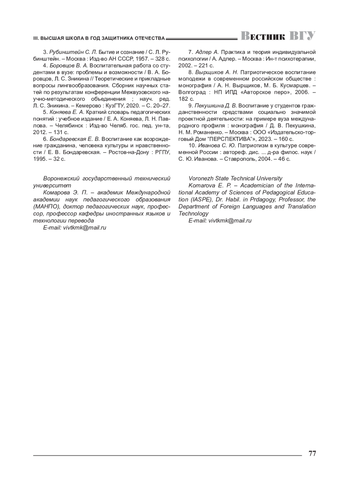 2. 	Комарова Э. П. Интеллектуально-эмоциональное развитие будущего педагога в контексте цифровой парадигмы: лингво-профессиональная подготовка / Э. П. Комарова, В. А. Федоров // Язык и культура в аспекте проблем языкового образования современной России: материалы Международного форума, посвященного Году педагога и наставника и 200-летию со дня рождения К. Д. Ушинского. Воронеж, 1-2 декабря 2023 года:в 3 ч. - Воронеж: Воронеж. гос. пед. ун-т, 2024. - С. 21-25.