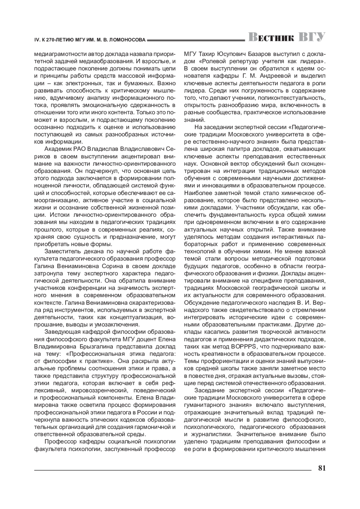 Представлен аналитический обзор материалов конференции «Педагогические традиции Московского университета», посвященной 270-летию вуза. Организатором мероприятия выступил факультет педагогического образования МГУ имени М. В. Ломоносова. В статье изложены ключевые идеи докладов, представленных сотрудниками Московского университета - деканами, профессорами, преподавателями, аспирантами различных факультетов, а также коллегами из других вузов.