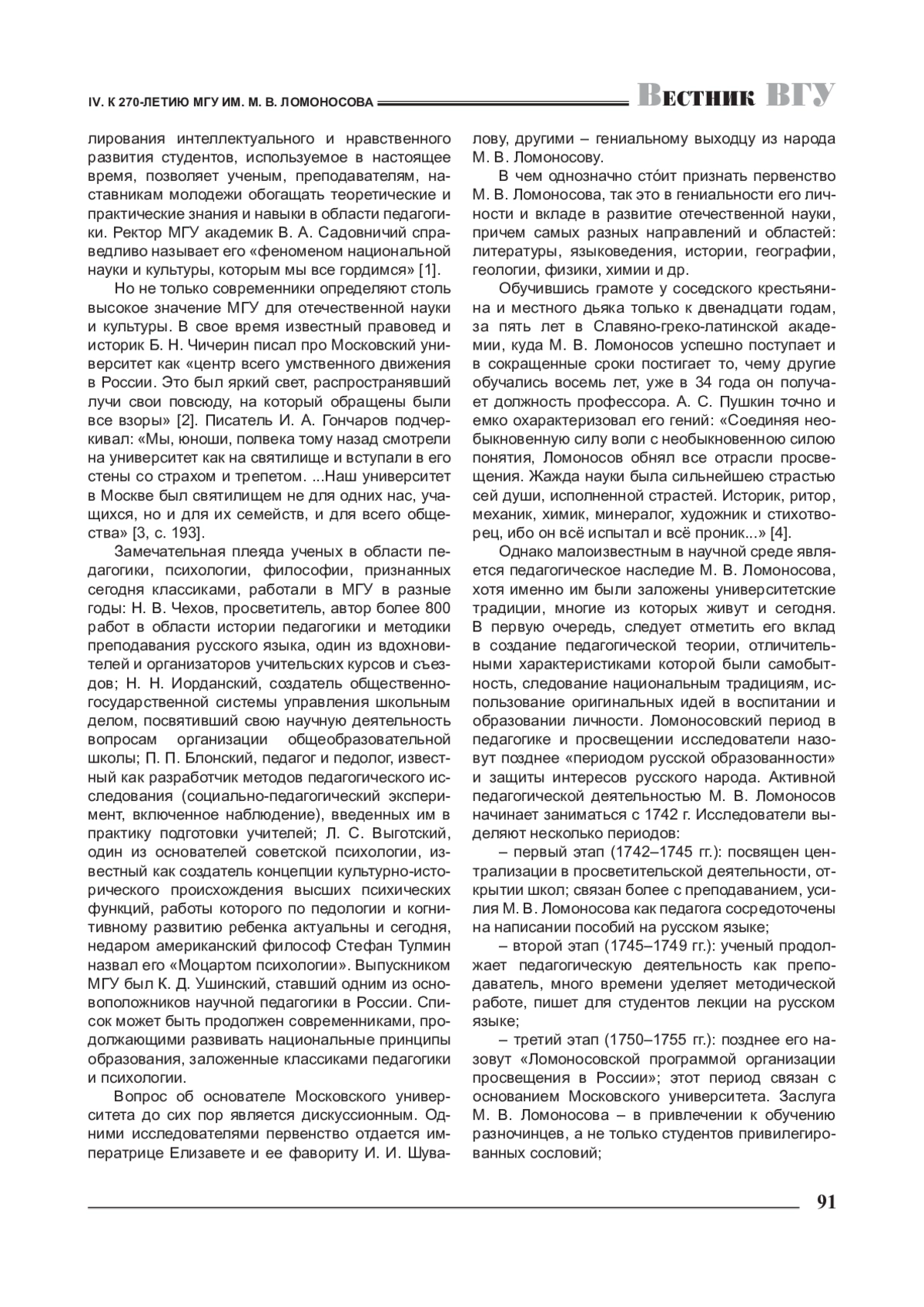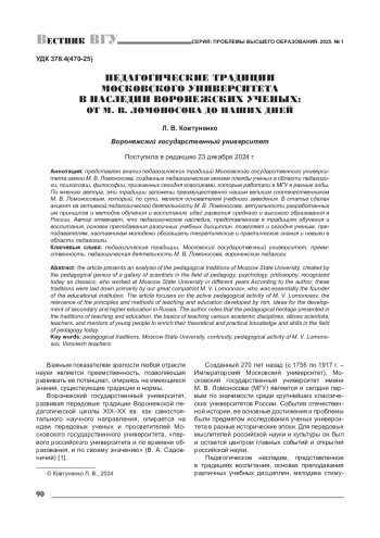 Представлен анализ педагогических традиций Московского государственного университета имени М. В. Ломоносова, созданных педагогическим гением плеяды ученых в области педагогики, психологии, философии, признанных сегодня классиками, которые работали в МГУ в разные годы. По мнению автора, эти традиции заложены преимущественно нашим великим соотечественником М. В. Ломоносовым, который, по сути, являлся основателем учебного заведения. В статье сделан акцент на активной педагогической деятельности М. В. Ломоносова, актуальности разработанных им принципов и методов обучения и воспитания, идей развития среднего и высшего образования в России. Автор отмечает, что педагогическое наследие, представленное в традициях обучения и воспитания, основах преподавания различных учебных дисциплин, позволяет и сегодня ученым, преподавателям, наставникам молодежи обогащать теоретические и практические знания и навыки в области педагогики.