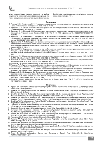 1. Аглеева З. Р., Алефиренко Н. Ф. Фразеологическое значение: когнитивные истоки и дискурсивно-модусная сущность // Гуманитарные исследования. 2020. № 2. С. 93-98.