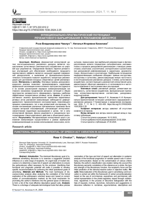 й дискурсологии, а выявление их функционально-прагматического потенциала позволит выработать конкретные рекомендации для достижения исходных оперативных целей рекламирования. Материалы и методы. Ключевые приемы дискурсивномодусного анализа позволяют проанализировать корреляцию формальной экспликации волюнтативного пространства адресата и на основе рассмотрения маркеров конвенционализации как главного механизма продвижения авторских интенций в общее пространство релевантности сформировать перечень наиболее эффективных инскриптивных речевых актов. Анализ. В аспекте системного анализа функциональной прагматики вариативных речевых актов рекламной коммуникации наблюдается дефицит адекватного терминологического инструментария, позволяющего прецизно номинировать тип и вид речеактовой альтернации. На основе контаминации различных критериальных признаков была создана авторская классификация, учитывающая иллокутивносемантические корреляции высказывания в целом, тип и силу иллокутивной функции, фокуса реципиента и инициальное прогнозирование стимул-реактивного действия в объективной реальности. Результаты. Метареализация иллокутивной цели в рекламной коммуникации осуществляется в рамках вербальной конвенционализации на основе использования комиссивов, экспозитивов, пермиссивов; при вербальной репрезентации в фатикорегулятивном аспекте посредством сатисфактивов, регламентивов; в процессе дискурсивной диалогизации с помощью реквестивов, инвитивов, инъюнктивов, инструктивов и суггестивов; при дискурсивной рефлексивизации в нарративах, аргументативах, дескриптивах и констативах. Наибольшим потенциалом перформативизации сообщения обладают прямые инструктивы, инструктивы и суггестивы, демонстрирующие низкую частотность в институциональном рекламном дискурсе. Степень суггестивного воздействия, соответствующего доминантной иллокутивной цели, демонстрирует обратную зависимость от интенсивности и частотности появления в тексте речеактовых альтернаций.