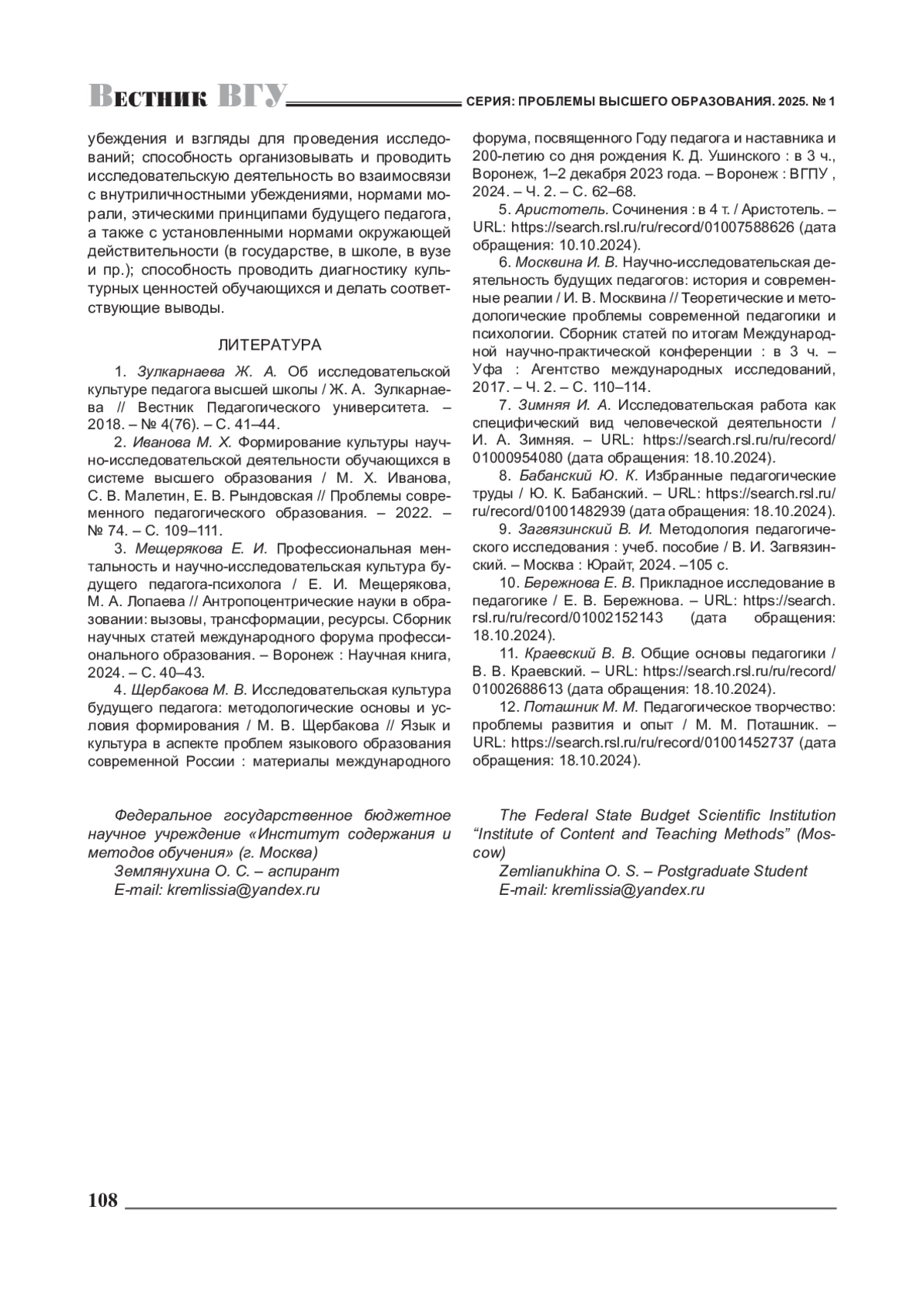 1. 	Зулкарнаева Ж. А. Об исследовательской культуре педагога высшей школы / Ж. А. Зулкарнаева // Вестник Педагогического университета. -2018. -№ 4(76). - С. 41-44. EDN: QTIURF