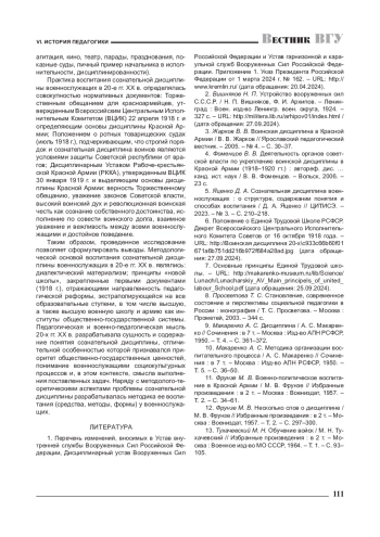 5. 	Яценко Д. А. Сознательная дисциплина военнослужащих: о структуре, содержании понятия и способах воспитания / Д. А. Яценко // ЦИТИСЭ. -2023. - № 3. - С. 210-218. EDN: IVYJWE
