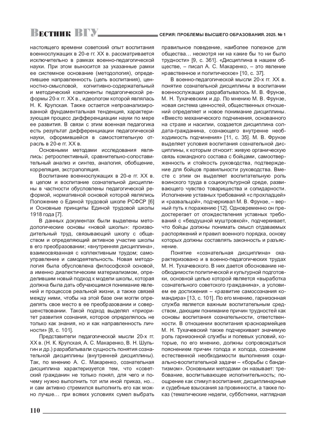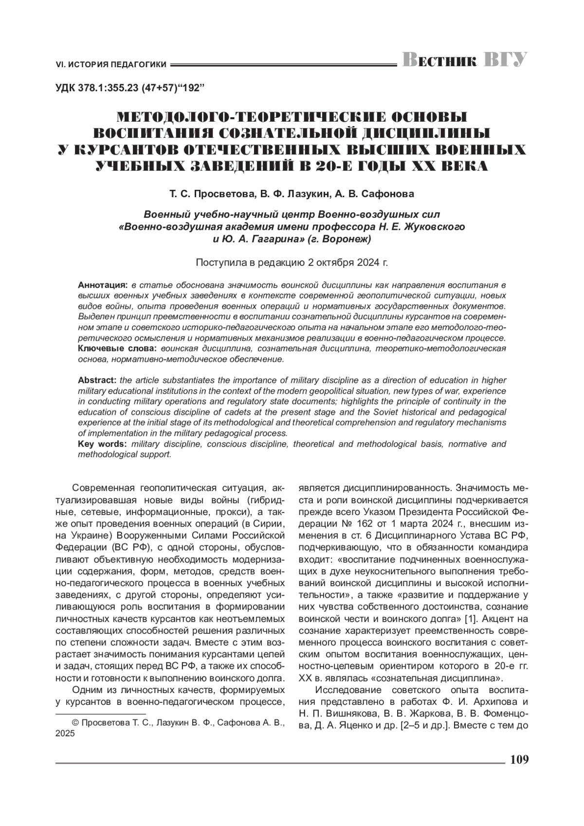 В статье обоснована значимость воинской дисциплины как направления воспитания в высших военных учебных заведениях в контексте современной геополитической ситуации, новых видов войны, опыта проведения военных операций и нормативных государственных документов. Выделен принцип преемственности в воспитании сознательной дисциплины курсантов на современном этапе и советского историко-педагогического опыта на начальном этапе его методолого-теоретического осмысления и нормативных механизмов реализации в военно-педагогическом процессе.