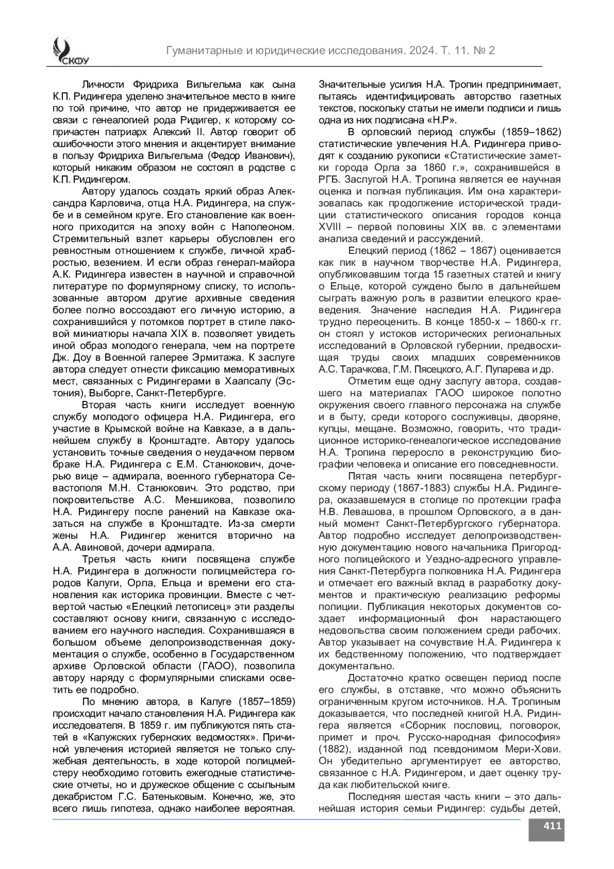 Для цитирования: Степанова Ю. В. Этюды эпохи через призму истории рода [Рецензия на книгу: Тропин Н. А. Неизвестный Ридингер: монография. Орел: Издательский Дом «Орлик», 2021. 216 с. ISBN 978-5-903259-84-7: 500 экз.]. Гуманитарные и юридические исследования. 2024;11(2):410-412. https://doi. org/10.37493/2409-1030.2024.2.26