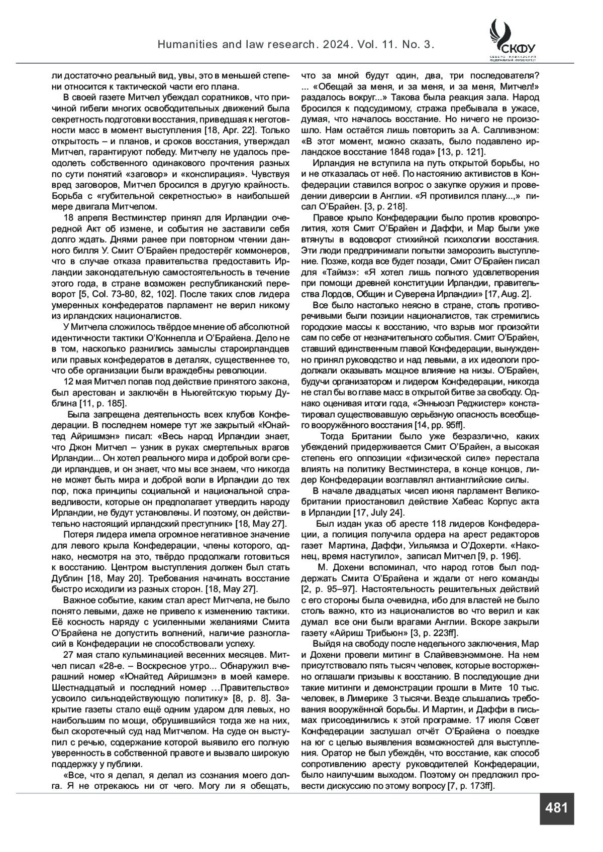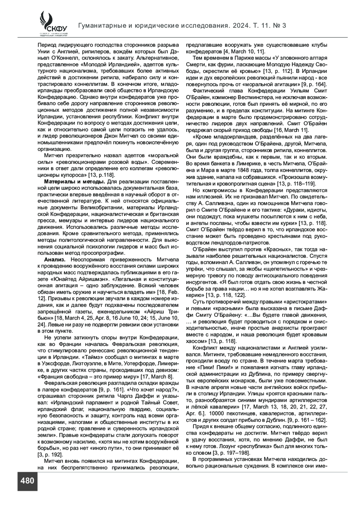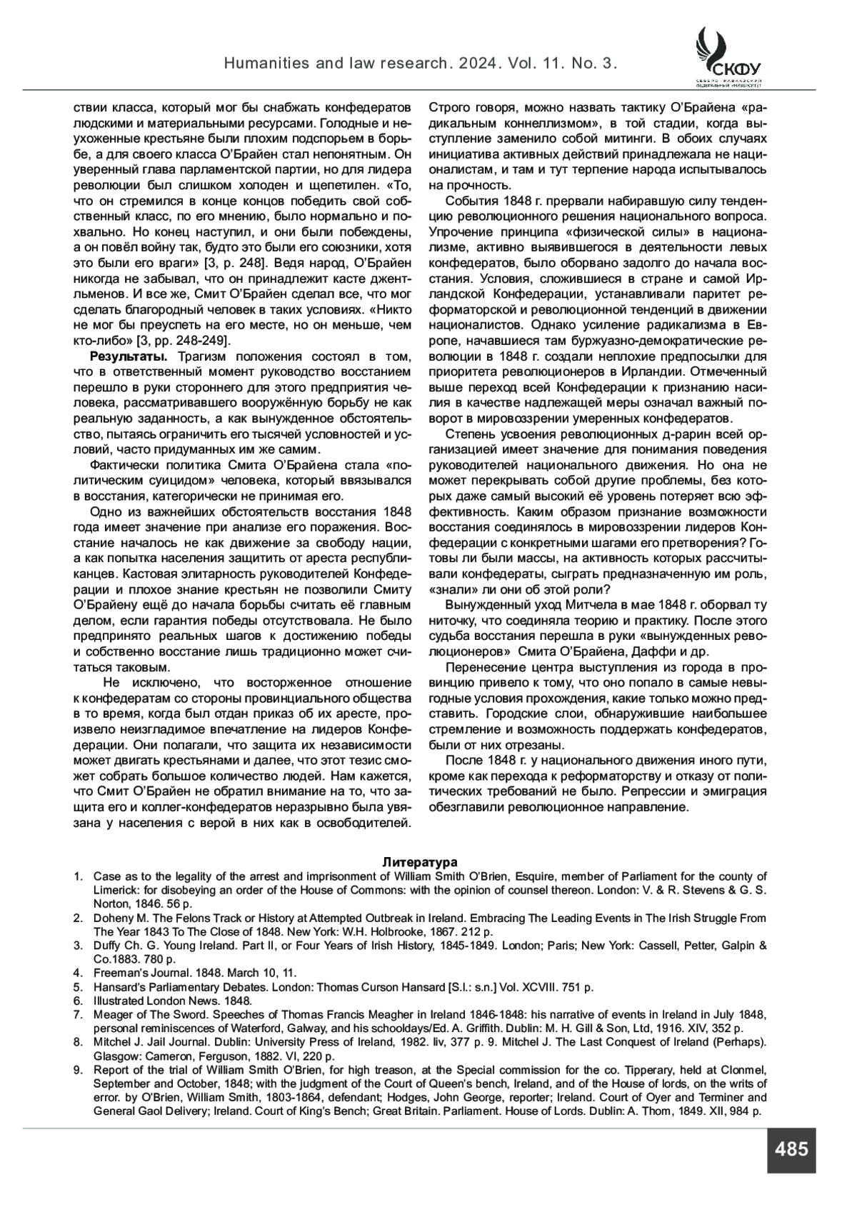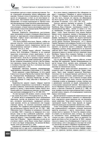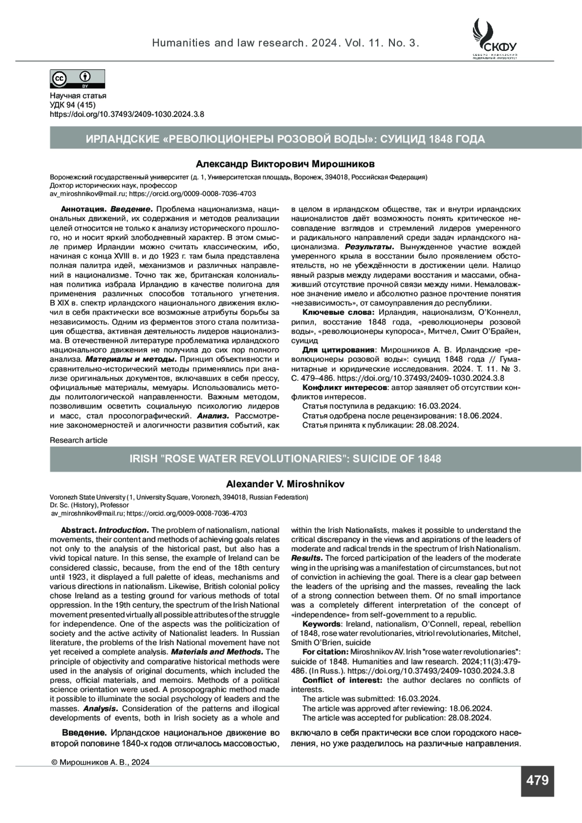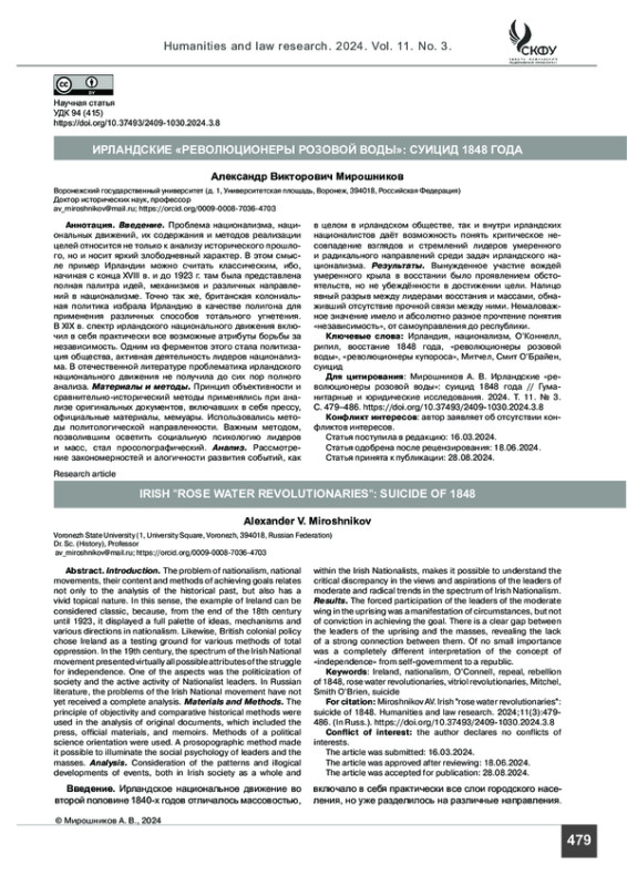 Аннотация. Введение. Проблема национализма, национальных движений, их содержания и методов реализации целей относится не только к анализу исторического прошлого, но и носит яркий злободневный характер. В этом смысле пример Ирландии можно считать классическим, ибо, начиная с конца XVIII в. и до 1923 г. там была представлена полная палитра идей, механизмов и различных направлений в национализме. Точно так же, британская колониальная политика избрала Ирландию в качестве полигона для применения различных способов тотального угнетения. В XIX в. спектр ирландского национального движения включил в себя практически все возможные атрибуты борьбы за независимость. Одним из ферментов этого стала политизация общества, активная деятельность лидеров национализма. В отечественной литературе проблематика ирландского национального движения не получила до сих пор полного анализа. Материалы и методы. Принцип объективности и сравнительно-исторический методы применялись при анализе оригинальных документов, включавших в себя прессу, официальные материалы, мемуары. Использовались методы политологической направленности. Важным методом, позволившим осветить социальную психологию лидеров и масс, стал просопографический. Анализ. Рассмотрение закономерностей и алогичности развития событий, как в целом в ирландском обществе, так и внутри ирландских националистов даёт возможность понять критическое несовпадение взглядов и стремлений лидеров умеренного и радикального направлений среди задач ирландского национализма. Результаты. Вынужденное участие вождей умеренного крыла в восстании было проявлением обстоятельств, но не убеждённости в достижении цели. Налицо явный разрыв между лидерами восстания и массами, обнаживший отсутствие прочной связи между ними. Немаловажное значение имело и абсолютно разное прочтение понятия «независимость», от самоуправления до республики.