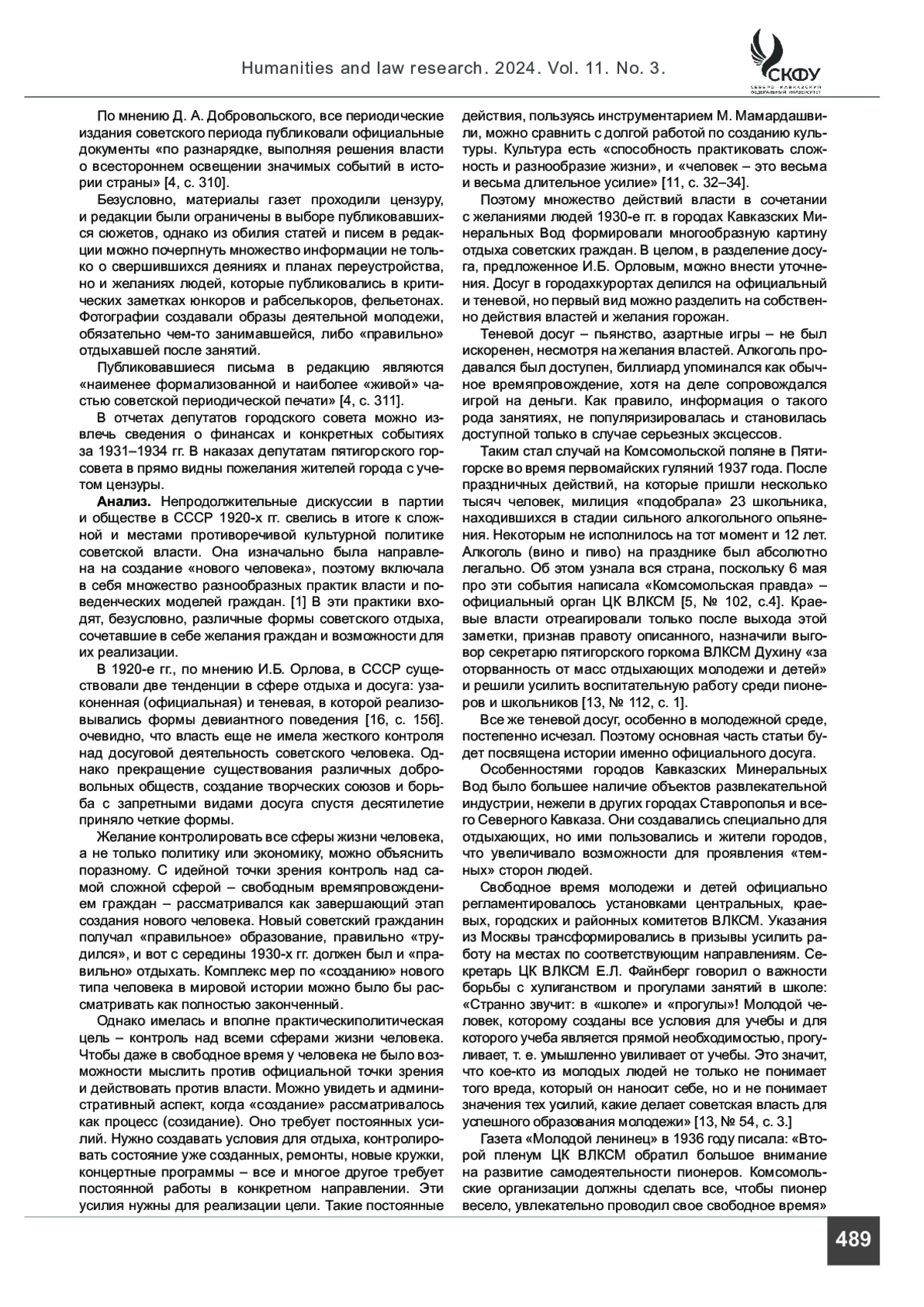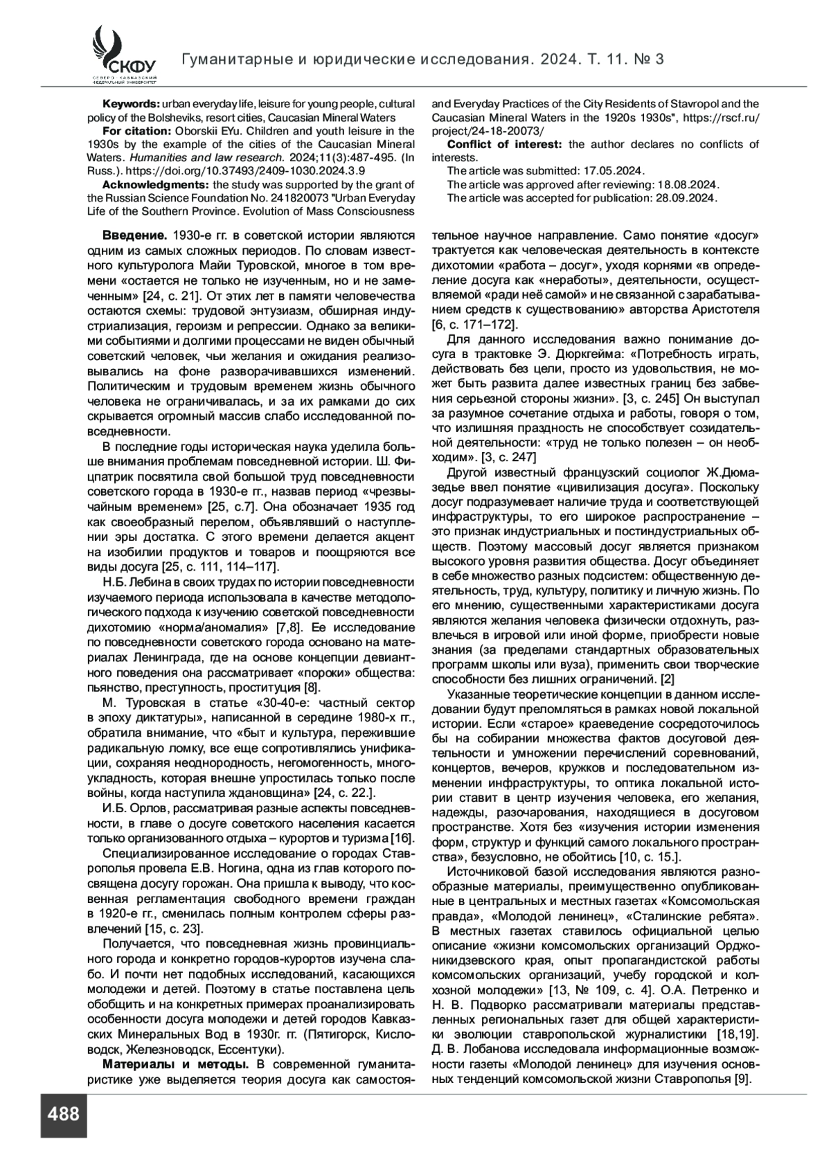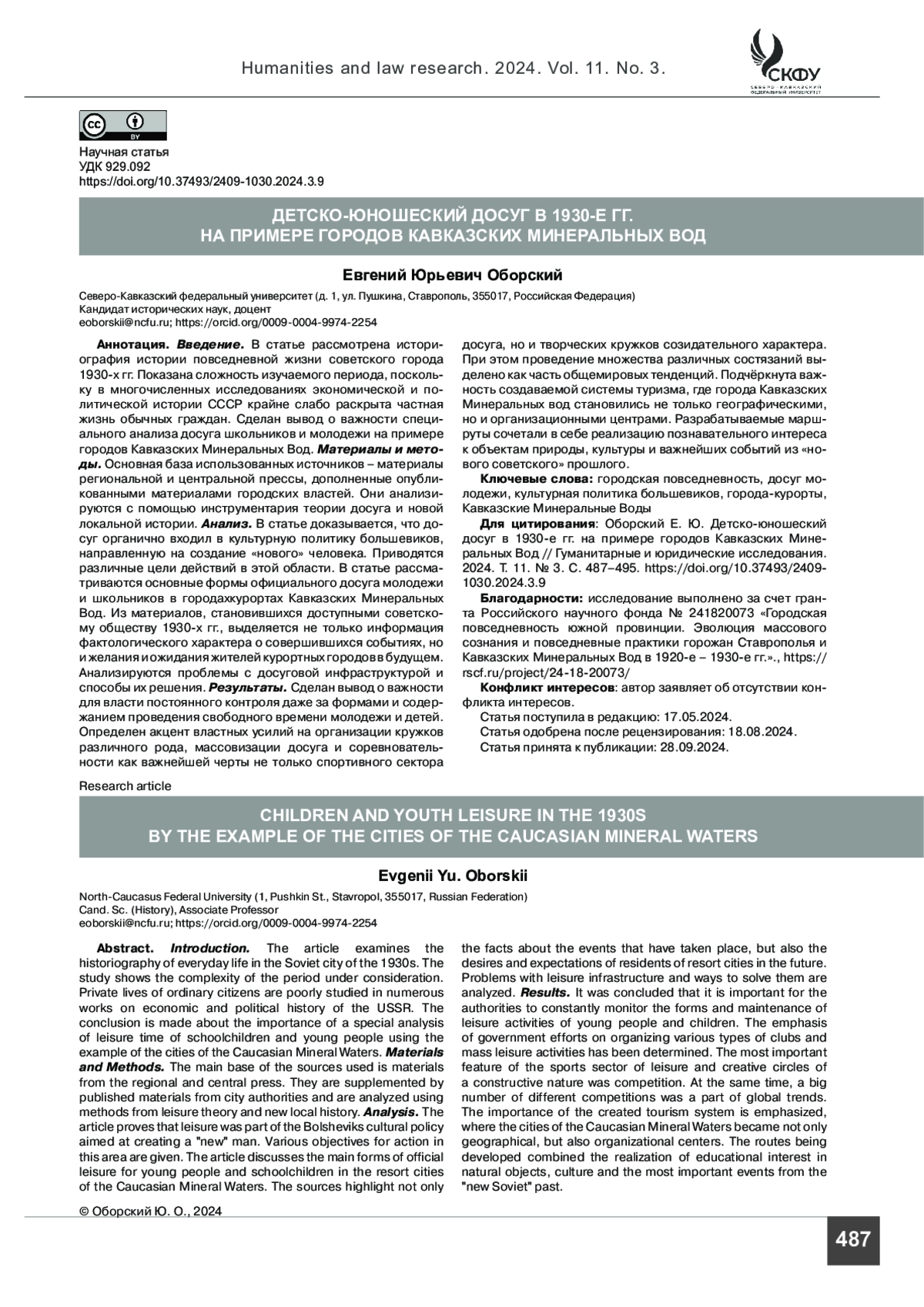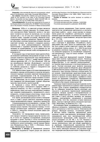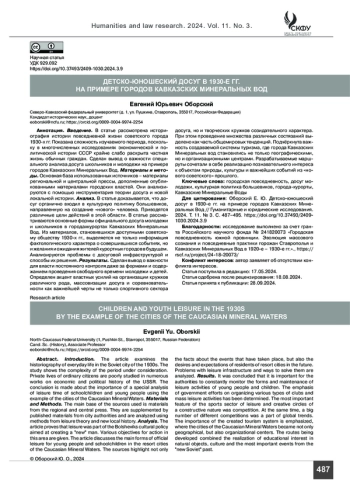 Введение. В статье рассмотрена историография истории повседневной жизни советского города 1930-х гг. Показана сложность изучаемого периода, поскольку в многочисленных исследованиях экономической и политической истории СССР крайне слабо раскрыта частная жизнь обычных граждан. Сделан вывод о важности специального анализа досуга школьников и молодежи на примере городов Кавказских Минеральных Вод.