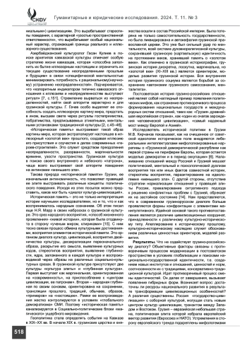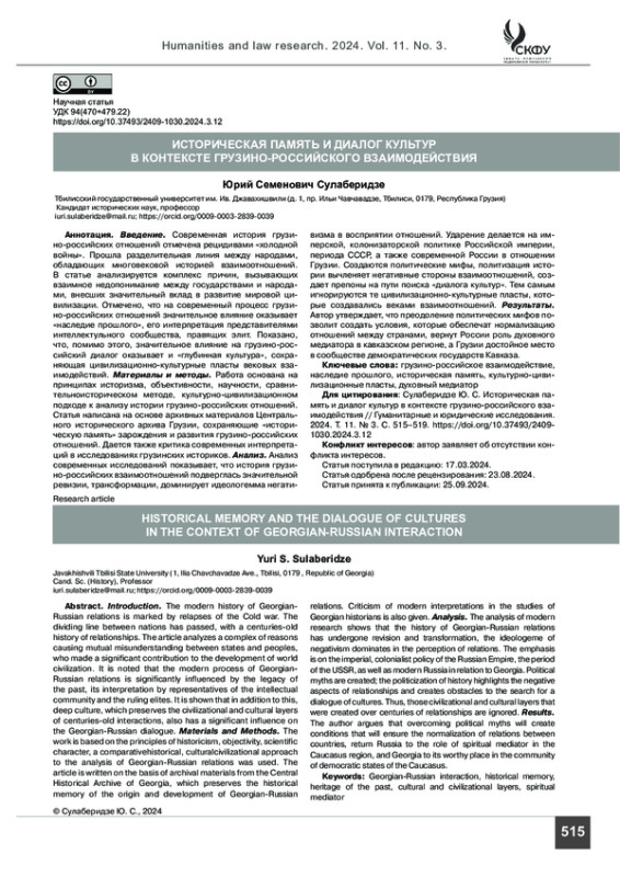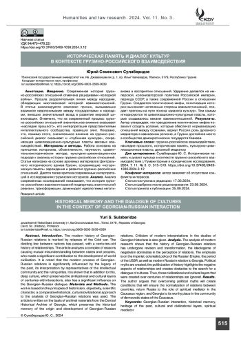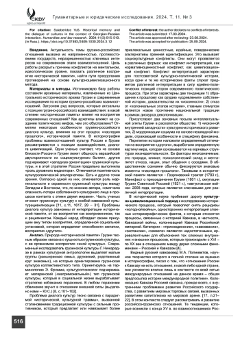 Введение. Современная история грузино-российских отношений отмечена рецидивами «холодной войны». Прошла разделительная линия между народами, обладающих многовековой историей взаимоотношений. В статье анализируется комплекс причин, вызывающих взаимное недопонимание между государствами и народами, внесших значительный вклад в развитие мировой цивилизации. Отмечено, что на современный процесс грузино-российских отношений значительное влияние оказывает «наследие прошлого», его интерпретация представителями интеллектульного сообщества, правящих элит. Показано, что, помимо этого, значительное влияние на грузино-российский диалог оказывает и «глубинная культура», сохраняющая цивилизационно-культурные пласты вековых взаимодействий.