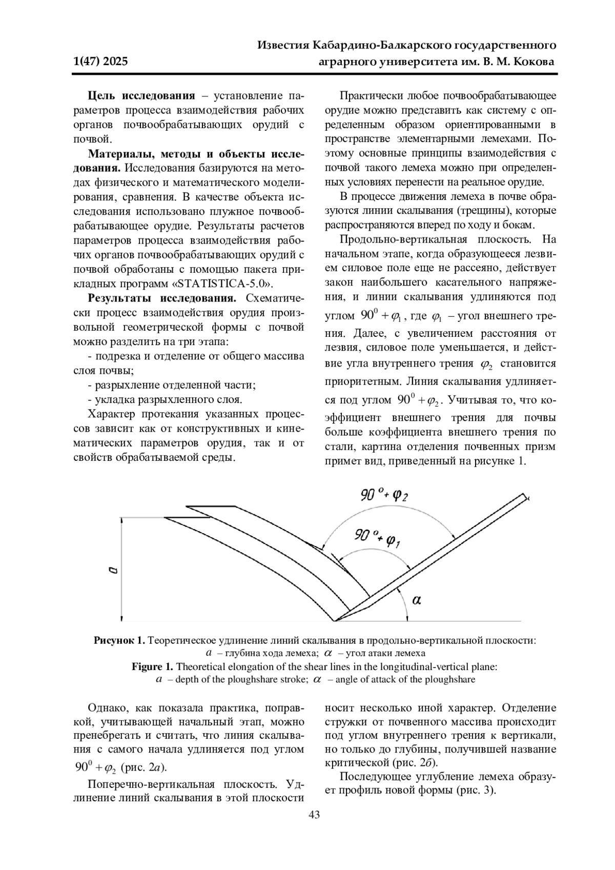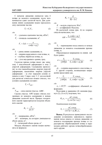 Механическая обработка почвы наряду с системой севооборотов, удобрения, защиты посевов от сорняков, вредителей и болезней является одним из важнейших звеньев любой системы земледелия. Во все времена обработка почвы была и остается одним из наиболее энергоемких и дорогих процессов в земледелии. По разным подсчетам сегодня в среднем на него приходится 40% энергетических и 25% трудовых затрат общего объема полевых работ. Современные требования к почвообрабатывающим орудиям требуют создания их на базе технологий, предусматривающих максимальную адаптацию к технологическому процессу с учетом конкретных почвенно-климатических условий работы. Основная цель при этом состоит в обеспечении необходимых показателей качества разрыхления, под которыми, прежде всего, понимают получение почвенных агрегатов определенного размера и улучшение технико-экономических результатов работы. Обеспечить получение на проектном этапе с достаточной долей вероятности именно необходимого размера агрегатов возможно при условии максимально полно разработанной математической модели взаимодействия рабочей поверхности орудия с обрабатываемой средой. Это, прежде всего, предполагает наличие математических моделей почвы и самого рабочего органа. Исследования базируются на методах физического и математического моделирования, сравнения. В качестве объекта исследования использовано плужное почвообрабатывающее орудие. Результаты расчетов параметров процесса взаимодействия рабочих органов почвообрабатывающих орудий с почвой обработаны с помощью пакета прикладных программ «STATISTICA-5.0». В результате проведенного исследования установлена зависимость перемещения носка лемеха от начала движения до момента откалывания призмы почвы от характеристик обрабатываемой почвы и параметров рабочего органа почвообрабатывающего орудия.