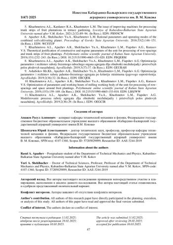 10. 	Оптимизация параметров и режимов работы фрезерного рабочего органа агрегата для обработки междурядий и приствольных полос плодовых насаждений / А. Л. Хажметова, А. К. Апажев, Ю. А. Шекихачев, Л. М. Хажметов, А. Г. Фиапшев, В. С. Курасов // Политематический сетевой электронный научный журнал Кубанского государственного аграрного университета. 2019. № 153. С. 159-169. DOI: 10.21515/1990-4665-153-018 EDN: LBSJWW