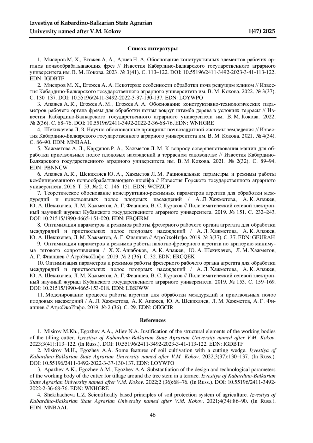 1. 	Мисиров М. Х., Егожев А. А., Алиев Н. А. Обоснование конструктивных элементов рабочих органов почвообрабатывающих фрез // Известия Кабардино-Балкарского государственного аграрного университета им. В. М. Кокова. 2023. № 3(41). С. 113-122. DOI: 10.55196/2411-3492-2023-3-41-113-122 EDN: IGDBTF