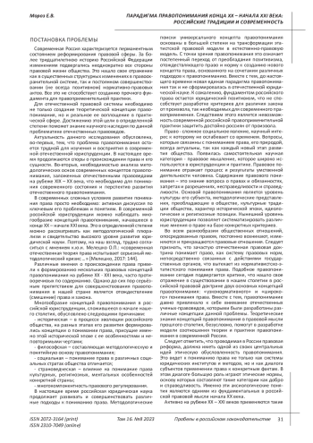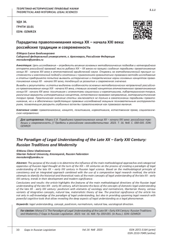Цель исследования - определить влияние основных методологических подходов и категорийного аппарата российской правовой мысли рубежа XIX - XX веков на процесс создания парадигмы правопонимания конца XX - начала XXI века в отечественной юридической науке. Опираясь на методологический принцип системности и комплексный подход в сочетании с применением сравнительно-правового метода исследования в статье предпринята попытка выявить исторические и теоретические корни основных концептов правопонимания конца XX - начала XXI века, тенденций их развития и современное значение. Выводы и результаты: в статье выделены особенности основных методологических направлений российского правопонимания конца ХIX - начала XX века, ставших основой концептов отечественного правопонимания конца XX - начала XXI века: позитивизм с элементами социологии и нормативизма, либертарианская теория, различные варианты интегративных концептов, естественно-правовое направление, материалистическая теория права. Практическая значение статьи заключается не только в самопознании парадигмы правопонимания, но и в обеспечении предстоящих правовых исследований мощным познавательным инструментарием, позволяющим раскрыть глубинные аспекты правопонимания как правового явления.