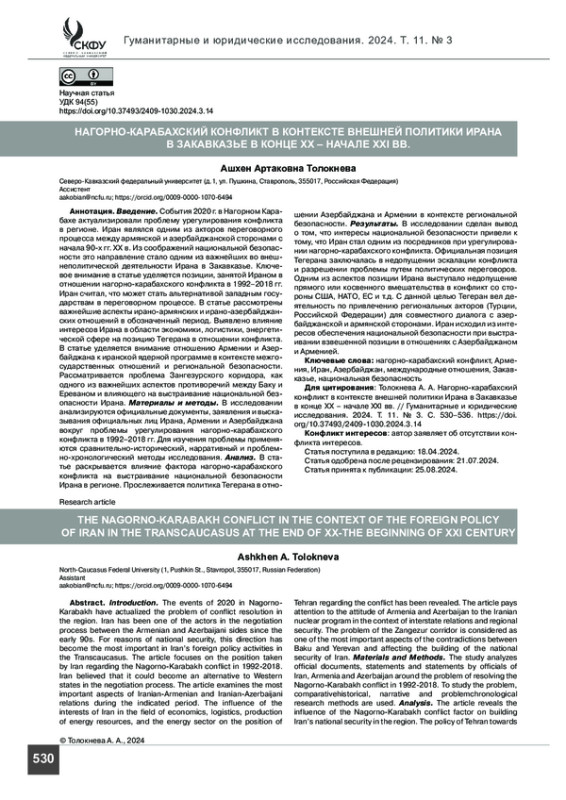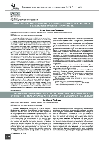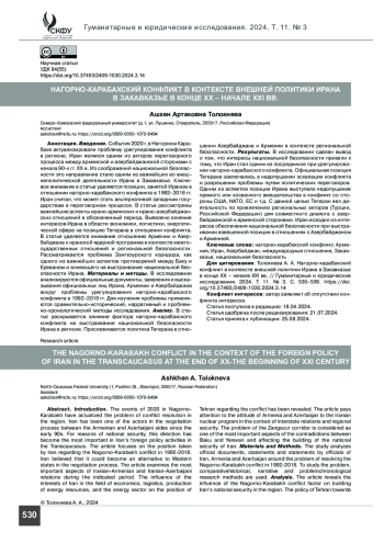 Введение. События 2020 г. в Нагорном Карабахе актуализировали проблему урегулирования конфликта в регионе. Иран являлся одним из акторов переговорного процесса между армянской и азербайджанской сторонами с начала 90-х гг. ХХ в. Из соображений национальной безопасности это направление стало одним из важнейших во внешнеполитической деятельности Ирана в Закавказье. Ключевое внимание в статье уделяется позиции, занятой Ираном в отношении нагорно-карабахского конфликта в 1992–2018 гг. Иран считал, что может стать альтернативой западным государствам в переговорном процессе. В статье рассмотрены важнейшие аспекты ирано-армянских и ирано-азербайджанских отношений в обозначенный период. Выявлено влияние интересов Ирана в области экономики, логистики, энергетической сфере на позицию Тегерана в отношении конфликта. В статье уделяется внимание отношению Армении и Азербайджана к иранской ядерной программе в контексте межгосударственных отношений и региональной безопасности. Рассматривается проблема Зангезурского коридора, как одного из важнейших аспектов противоречий между Баку и Ереваном и влияющего на выстраивание национальной безопасности Ирана. Материалы и методы. В исследовании анализируются официальные документы, заявления и высказывания официальных лиц Ирана, Армении и Азербайджана вокруг проблемы урегулирования нагорно-карабахского конфликта в 1992–2018 гг. Для изучения проблемы применяются сравнительно-исторический, нарративный и проблемно-хронологический методы исследования. Анализ. В статье раскрывается влияние фактора нагорно-карабахского конфликта на выстраивание национальной безопасности Ирана в регионе. Прослеживается политика Тегерана в отношении Азербайджана и Армении в контексте региональной безопасности. Результаты. В исследовании сделан вывод о том, что интересы национальной безопасности привели к тому, что Иран стал одним из посредников при урегулировании нагорно-карабахского конфликта. Официальная позиция Тегерана заключалась в недопущении эскалации конфликта и разрешении проблемы путем политических переговоров. Одним из аспектов позиции Ирана выступало недопущение прямого или косвенного вмешательства в конфликт со стороны США, НАТО, ЕС и т. д. С данной целью Тегеран вел деятельность по привлечению региональных акторов (Турции, Российской Федерации) для совместного диалога с азербайджанской и армянской сторонами. Иран исходил из интересов обеспечения национальной безопасности при выстраивании взвешенной позиции в отношениях с Азербайджаном и Арменией.