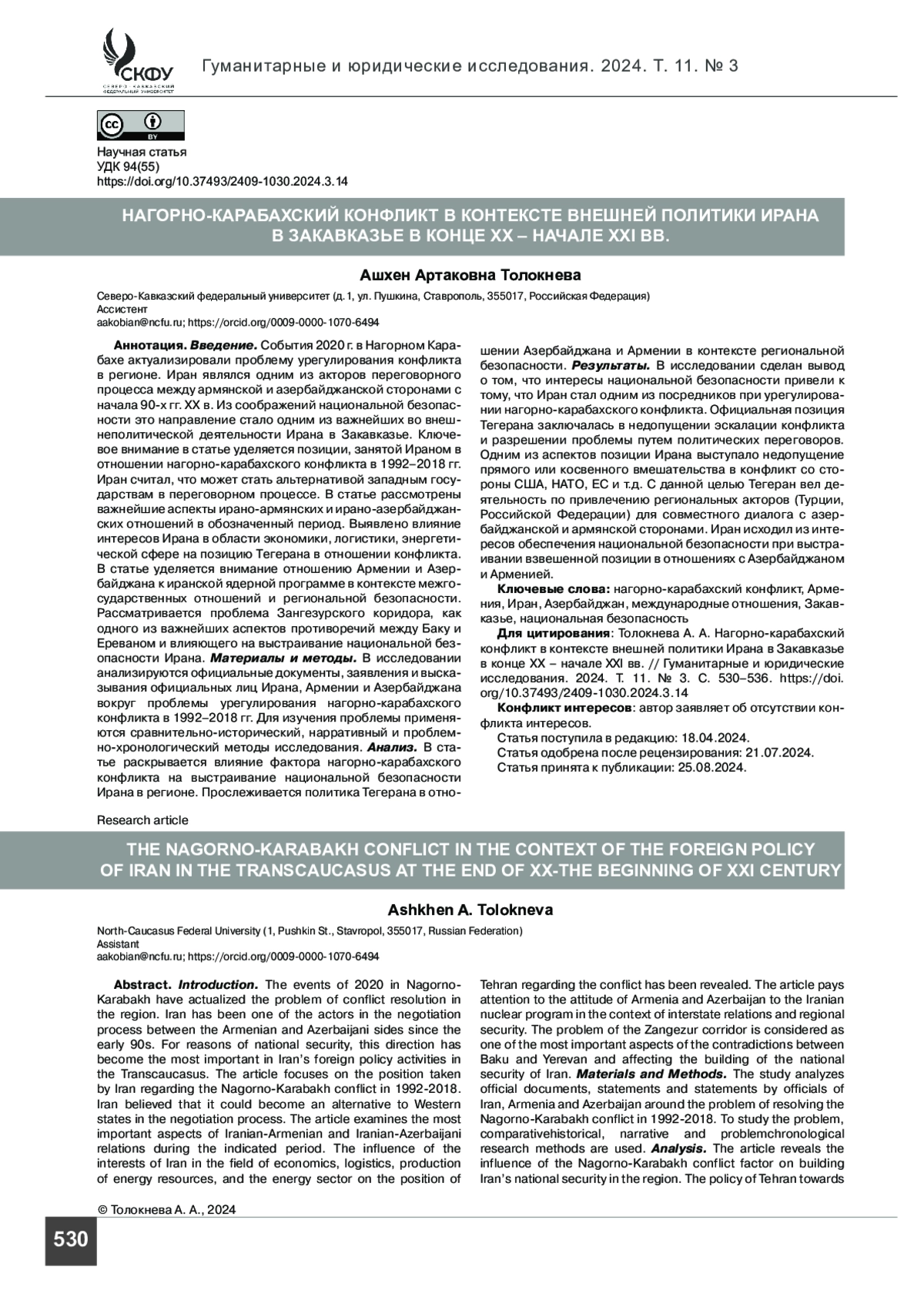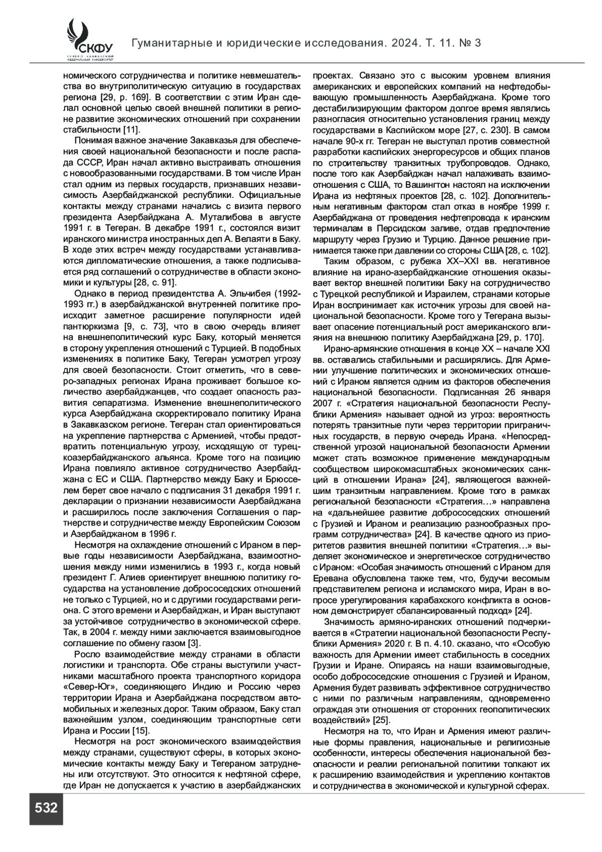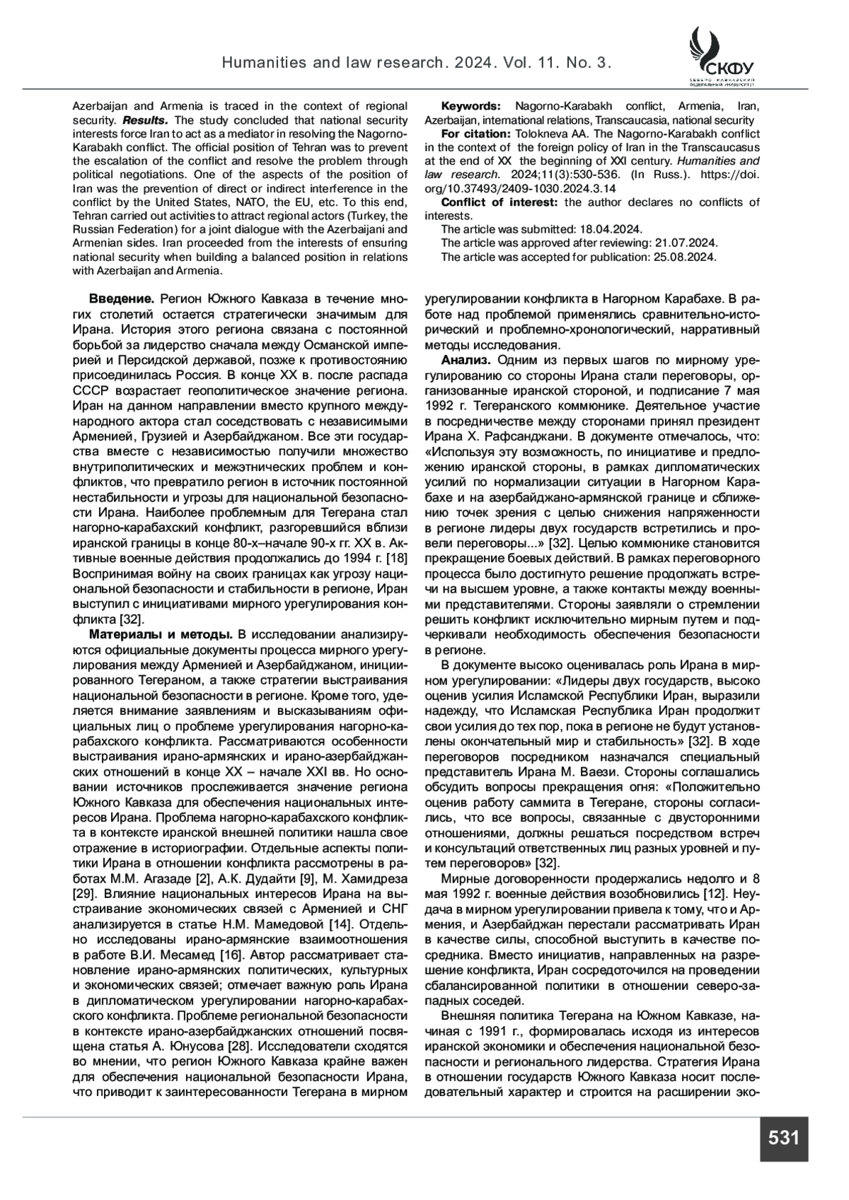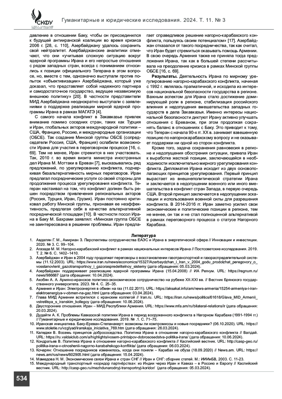 2. Агазаде М. М. Нагорно-карабахский конфликт в рамках национальных интересов Ирана // Постсоветские исследования. 2019. Т. 2. № 6. С. 1402-1410.