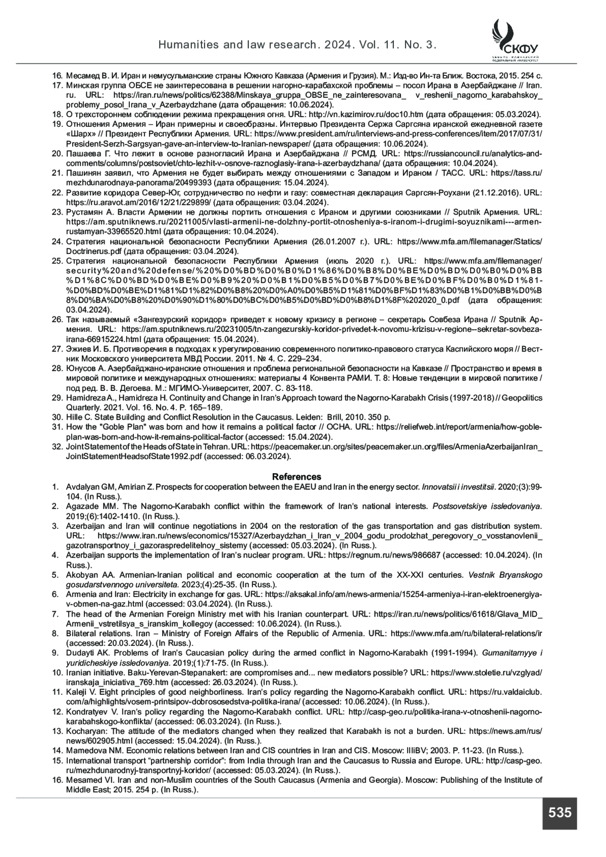 11. Каледжи В. Восемь принципов добрососедства. Политика Ирана в отношении нагорно-карабахского конфликта // Валдай. URL: https://ru.valdaiclub.com/a/highlights/vosem-printsipov-dobrososedstva-politika-irana (дата обращения: 10.06.2024).