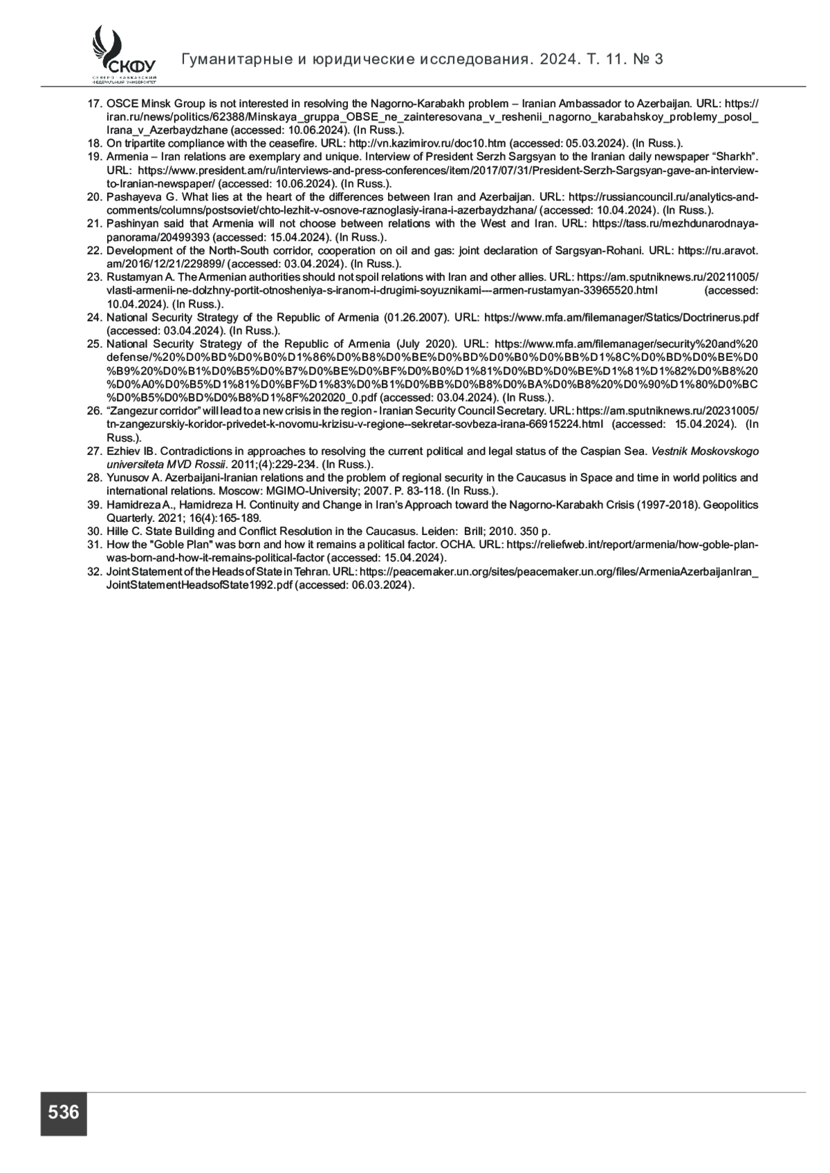 17. Минская группа ОБСЕ не заинтересована в решении нагорно-карабахской проблемы - посол Ирана в Азербайджане // Iran.ru. URL: https://iran.ru/news/politics/62388/Minskaya_gruppa_OBSE_ne_zainteresovana_ v_reshenii_nagorno_karabahskoy_problemy_posol_Irana_v_Azerbaydzhane (дата обращения: 10.06.2024).