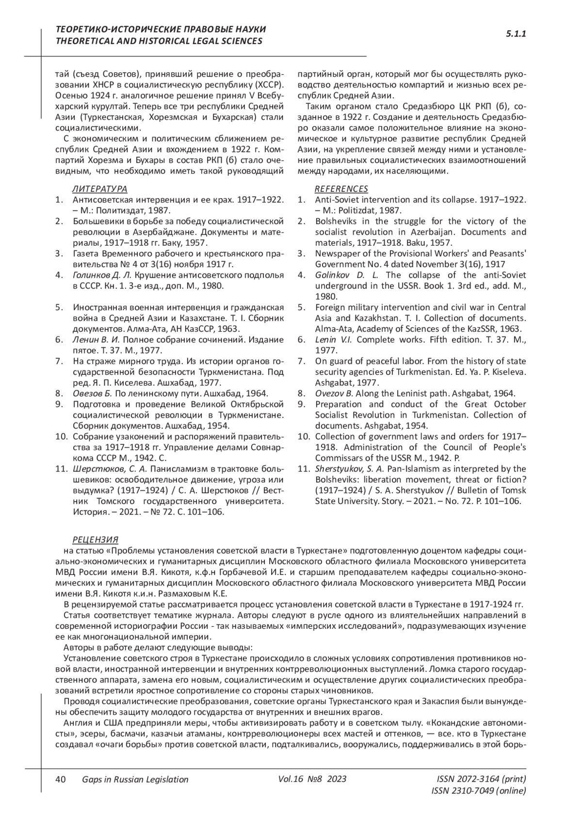 Целью статьи является исследование процесса установления советской власти в Туркестане в 1917-1924 гг. Авторы показывают, что установление советского строя в Туркестане происходило в сложных условиях сопротивления противников новой власти, иностранной интервенции и внутренних контрреволюционных выступлений. Наряду с созданием регулярной армии для защиты молодой государственности предпринимались меры социально-политического, экономического и идеологического характера.