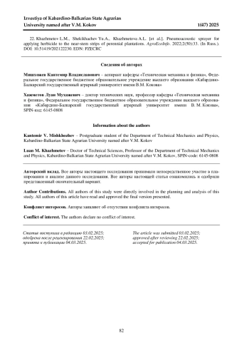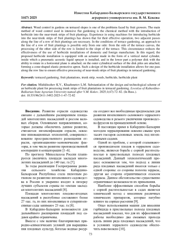 12. 	Мишхожев К. В., Хажметов Л. М., Хажметов К. Л. Тенденция развития установок для внесения гербицида в приствольные полосы плодовых насаждений в террасном садоводстве // Актуальные проблемы аграрной науки: прикладные и исследовательские аспекты: сб. науч. тр. III Всероссийской (национальной) научно-практической конференции. Нальчик: Кабардино-Балкарский ГАУ, 2023. С. 141-146. EDN: LPRZWX
