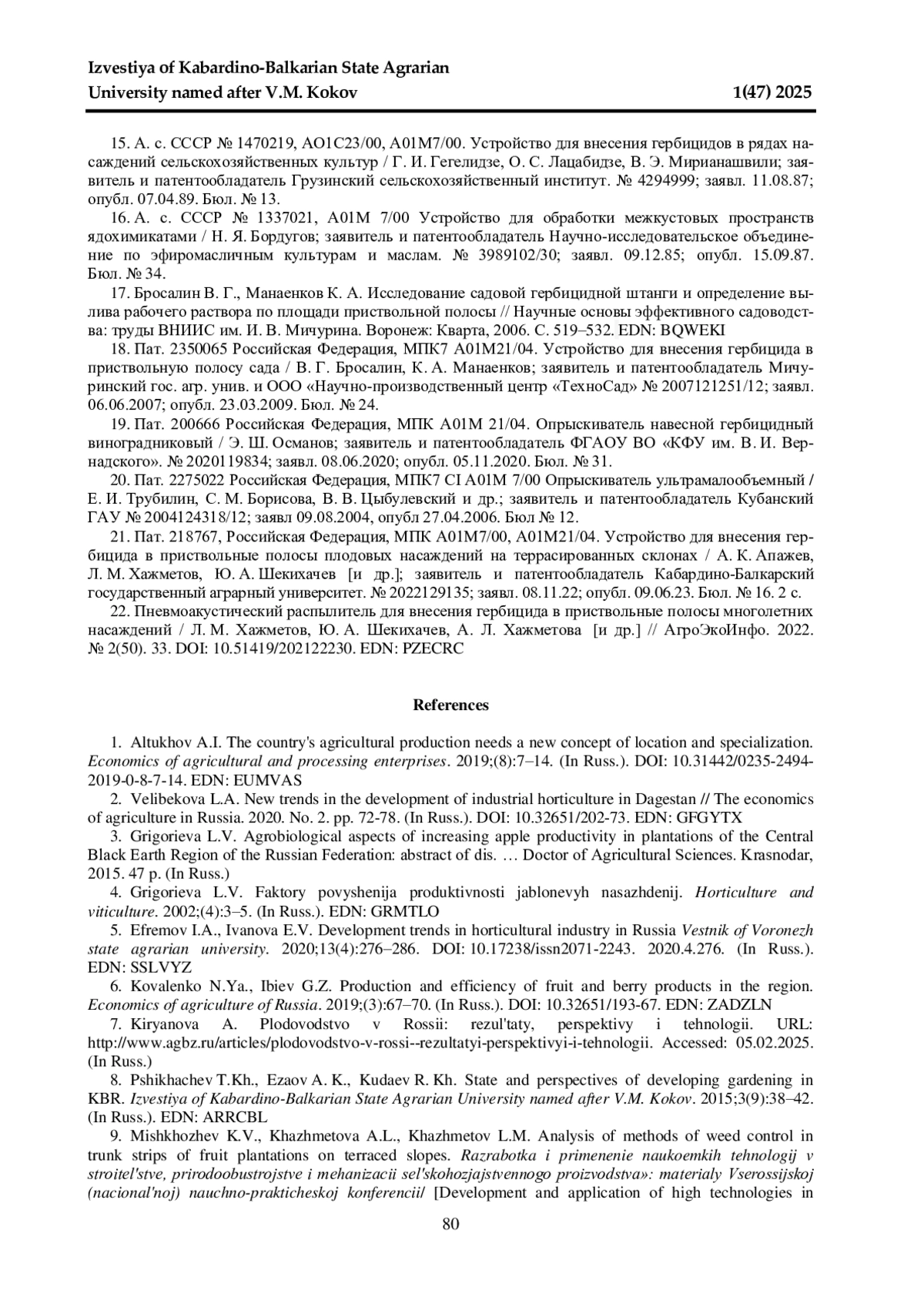 21. 	Пат. 218767, Российская Федерация, МПК А01М7/00, А01М21/04. Устройство для внесения гербицида в приствольные полосы плодовых насаждений на террасированных склонах / А. К. Апажев, Л. М. Хажметов, Ю. А. Шекихачев [и др.]; заявитель и патентообладатель Кабардино-Балкарский государcтвенный аграрный университет. № 2022129135; заявл. 08.11.22; опубл. 09.06.23. Бюл. № 16. 2 с.