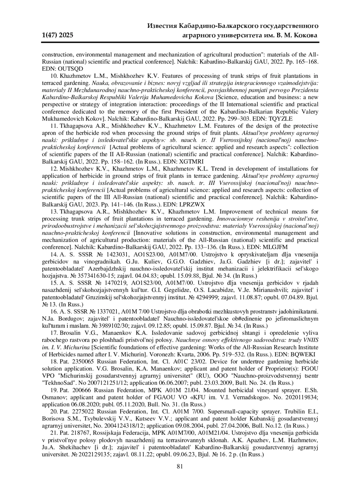 13. 	Тхагапсова А. Р., Мишхожев К. В., Хажметов Л. М. Совершенствование технических средств для обработки приствольных полос плодовых насаждений в террасном садоводстве // Инновационные решения в строительстве, природообустройстве и механизации сельскохозяйственного производства: материалы Всероссийской (национальной) научно-практической конференции. Нальчик: Кабардино- Балкарский ГАУ, 2022. С. 133-136. EDN: MLGJFM